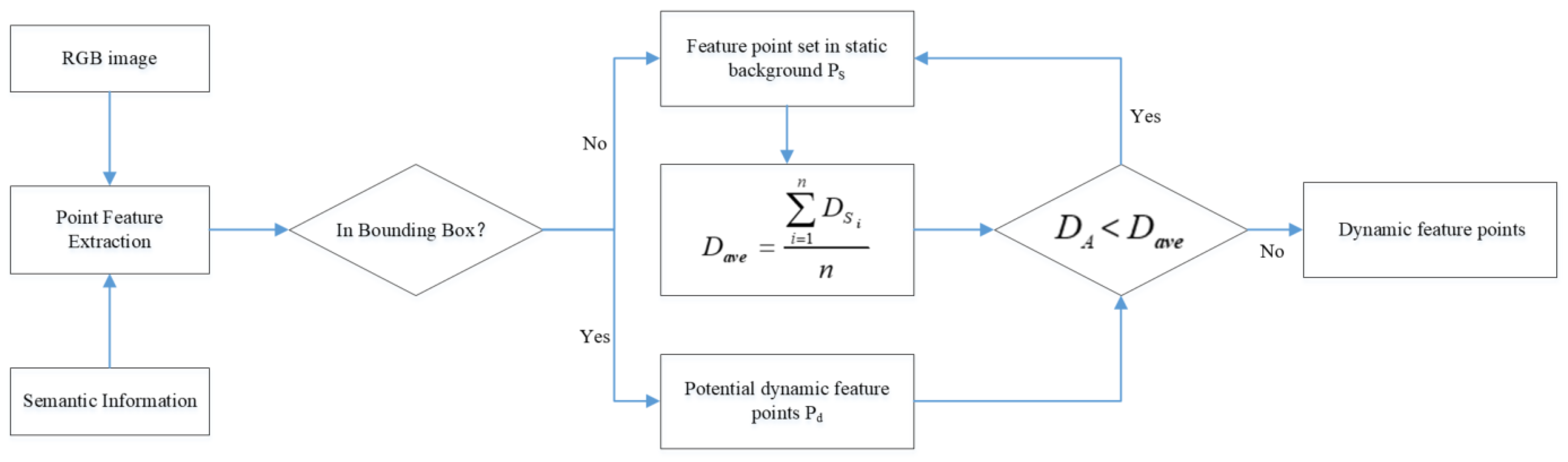 | Input: Previous frame’s feature point P1, Current frame’s feature point P2, Bounding BOX x1, y1, x2, y2 Output: The set of static feature points in the current frame, S F = FindFundmentalMat (P2, P1, seven-point method based on RANSAC) for each matched pair p1, p2 in P1, P2 do: if (Bounding BOX exist) then if (xp < x1||xp > x2||yp < y1||yp > y2) then Append p2 to S & DSi = CalEpipolarLineDistance (p1, p2, F) Traverse the number of feature points in S obtain && = DSi / end if else DA = CalEpipolarLineDistance (p1, p2, F) if (DA < ) then Append p2 to S end if else Append p2 to S end if end for |