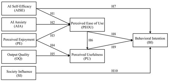 BI is positively influenced by AISE [35]. PU and PEOU are two important predictors of BI [42]. Dwivedi suggested improving the PEOU of the system to enhance users’ BI [43], and Chocarro et al. found that the PU of chatbots positively affects teachers’ BI of using technology [44]. In addition, studies have shown that SI has a positive impact on students’ BI to use chatbots for teaching [16]. Therefore, we propose the following hypotheses: