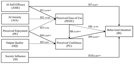 Hypothesis testing of the overall model. The dashed line indicates the lack of significance; *** p < 0.001; * p < 0.05.
