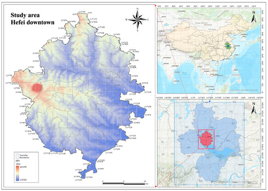 Location and topographic map of the urban study area of Hefei downtown, Anhui province, China.