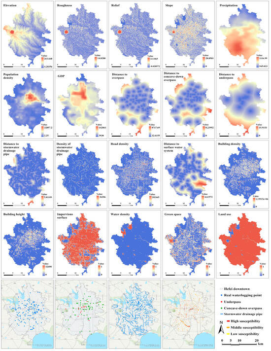 Data for all indicators in Table 1 were collected from multi-source datasets and standardized to a 100 m × 100 m grid resolution in ArcGIS Pro. Zonal statistics were used to generate spatial distributions (Figure 2). In addition, 139 waterlogging-prone locations were obtained from the Comprehensive Urban Drainage and Waterlogging Prevention Plan of Hefei (2013–2020), hereafter “Plan 2020,” and used as labeled samples for susceptibility assessment.