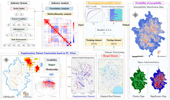 In the previous sections, we introduced the datasets and acquisition process for UWSA. Building on this foundation, the proposed framework integrates HWR and PI-Priors through four core modules: indicator selection and analysis, construction of the supplementary dataset from PI-Priors, UWSA model development, and generation and interpretation of susceptibility probability maps (Figure 4).