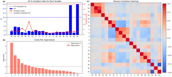 Multicollinearity diagnostics based on VIF, Condition Index, Eigenvalues, and Pearson Correlation: (a) VIF and Condition Index for each variable, VIF < 10 and Condition Index < 30 indicate that most variables exhibit the minimum collinearity, (b) scree plot of eigenvalues, the eigenvalues of the first six components are greater than 1, meaning that there is almost no redundant information among most predictors, (c) Pearson correlation heatmap, color reflects the correlation within the group.