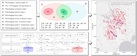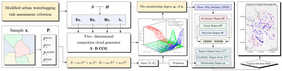 - To address the heterogeneity of polygon-based waterlogging risk distributions, a dimension-reduction sampling framework is introduced based on TWD theory. It integrates an MCCM and the CRITIC-TOPSIS method, which integrates the CRITIC (Criteria Importance Through Intercriteria Correlation) method and the TOPSIS (Technique for Order Preference by Similarity to Ideal Solution) method, to quantify membership degrees of overlapping risk levels, while also assessing credibility and social influence scores to support robust point-based sampling in spatially complex environments.