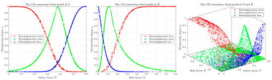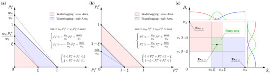 Based on Table 3, the numerical characteristics required to construct the MCCM can be calculated. As shown in Figure 8c, the expected value for the waterlogging-prone area, denoted as , is clearly because in this case reaches its minimum, while reaches its maximum. Similarly, the expected value for the waterlogging-safe area, is . For the fuzzy area, the center point represents the most ambiguous classification, and its expected value is calculated as . The remaining parameters are calculated as follows: