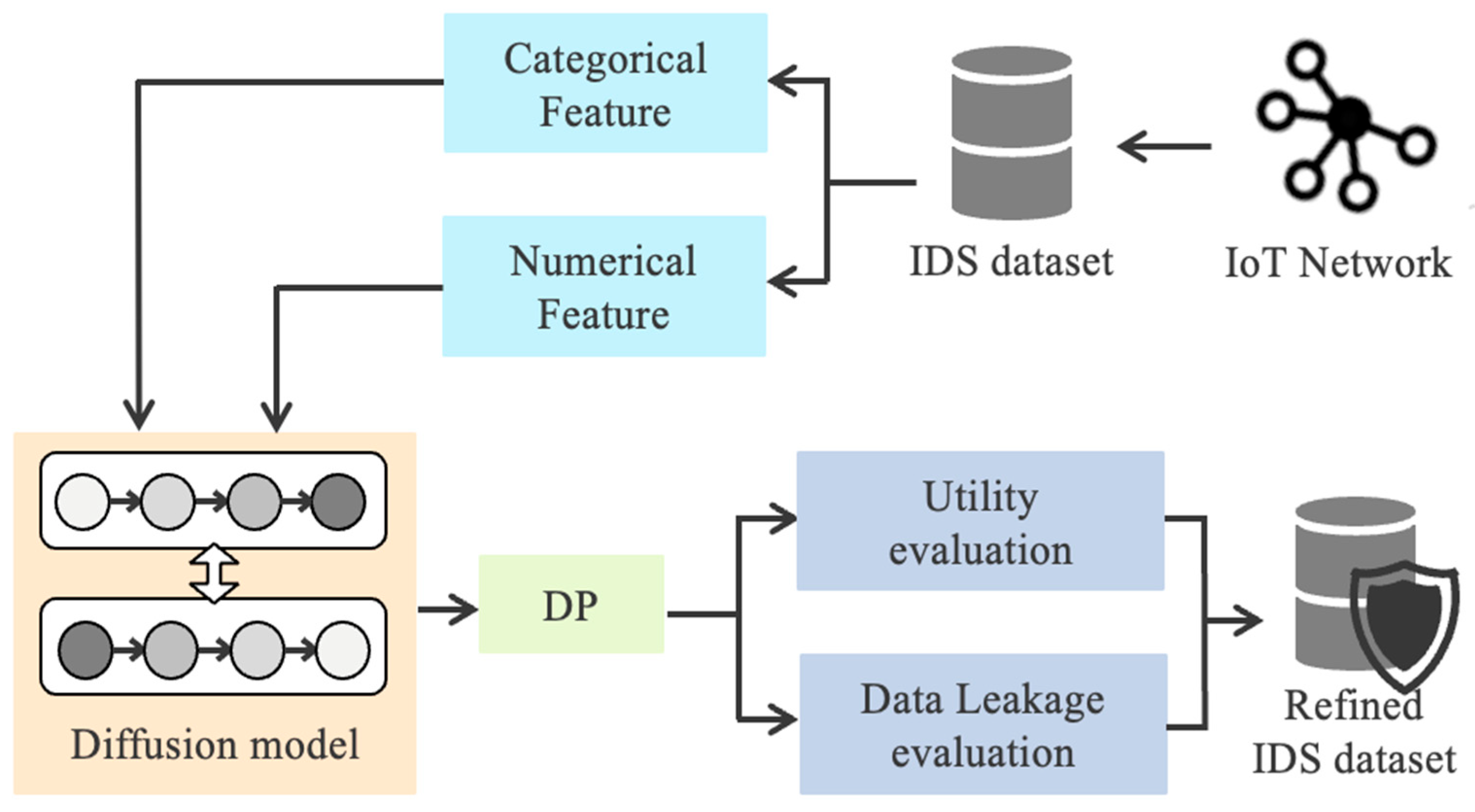 17]. While this foundational study demonstrated the viability of model-based synthetic data for IDS training, it did not explicitly address the critical issue of privacy preservation. Raw network data, even when used to build a model, often contains sensitive information, and generating data based on its distribution may inadvertently leak private patterns or expose individuals.