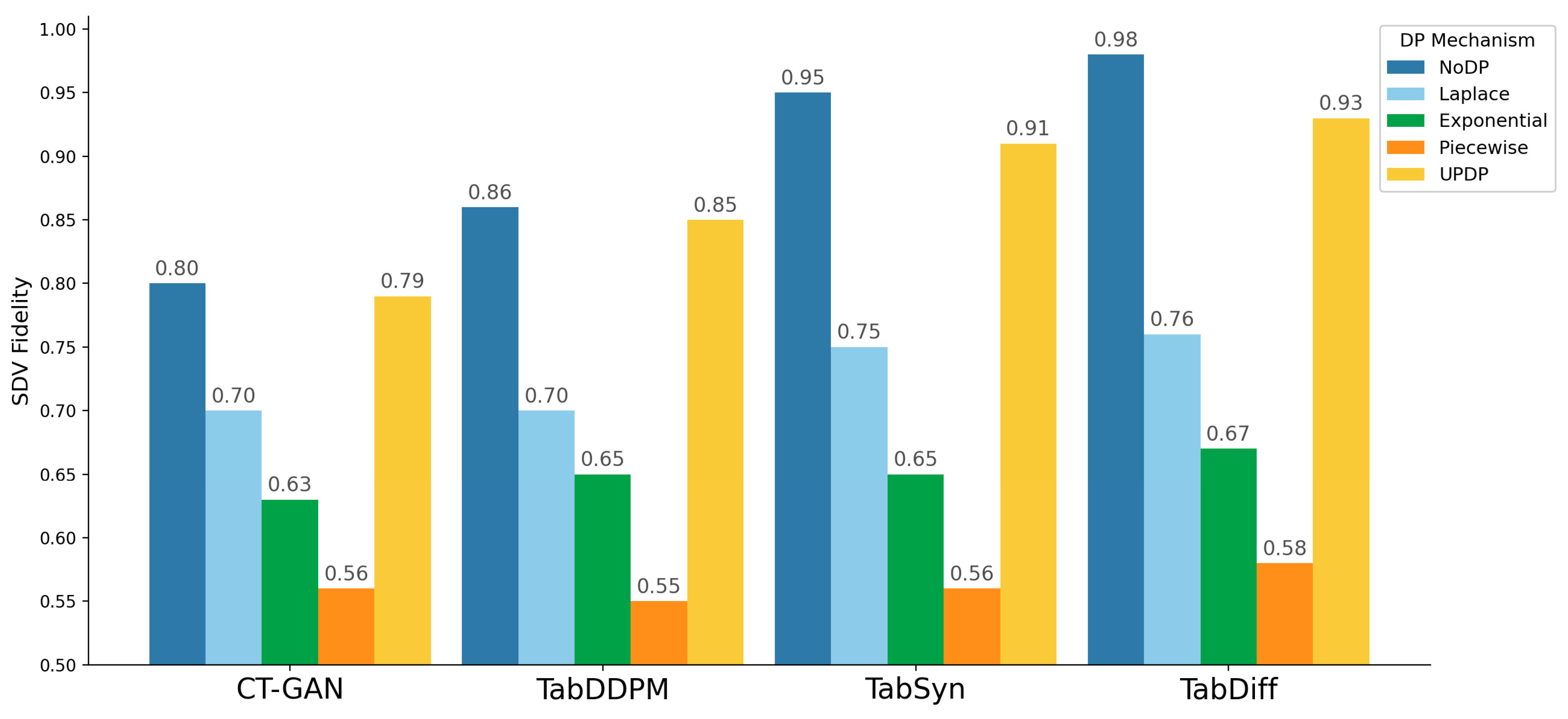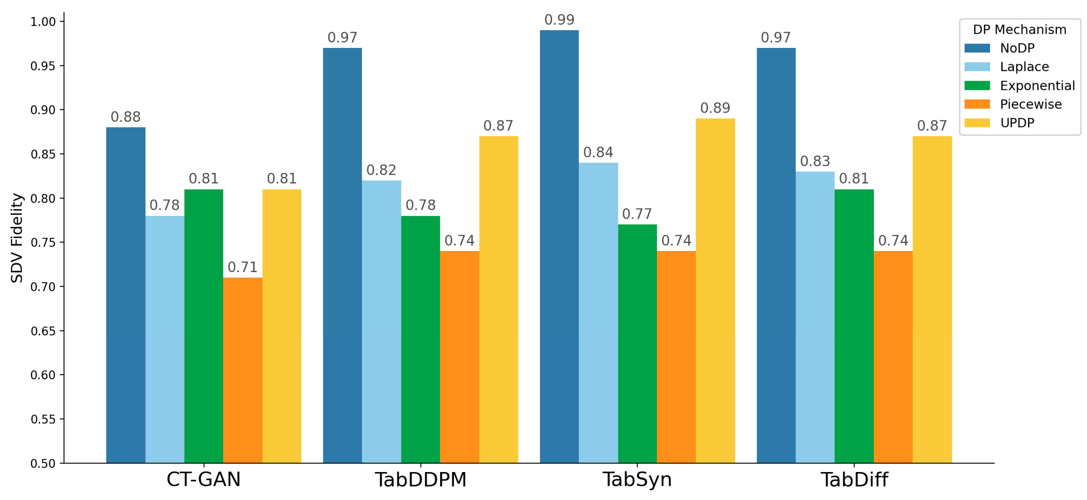 SDV Fidelity when applying DP to TabDDPM, TabSyn, and TabDiff on CSE-CIC-IDS2018 dataset.