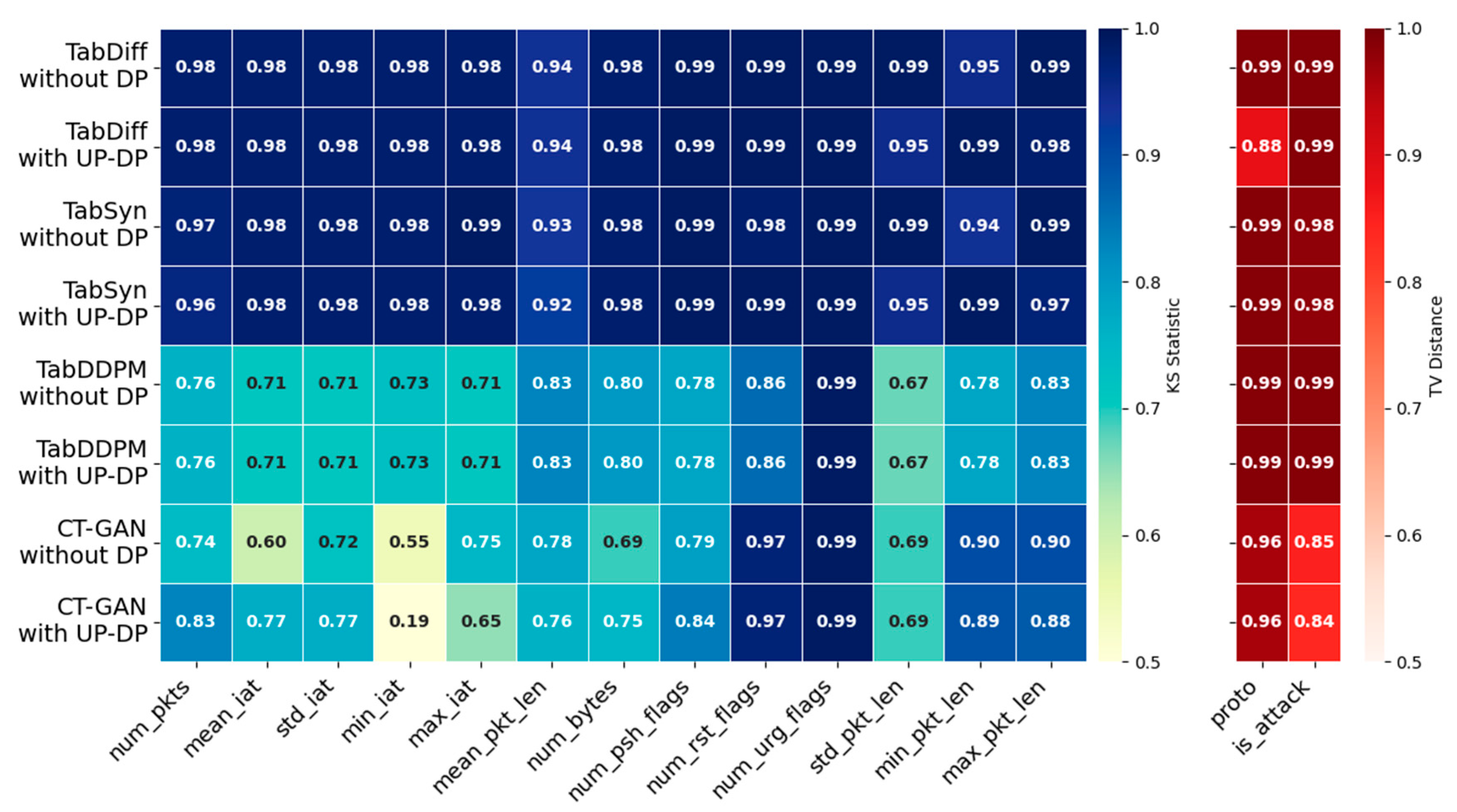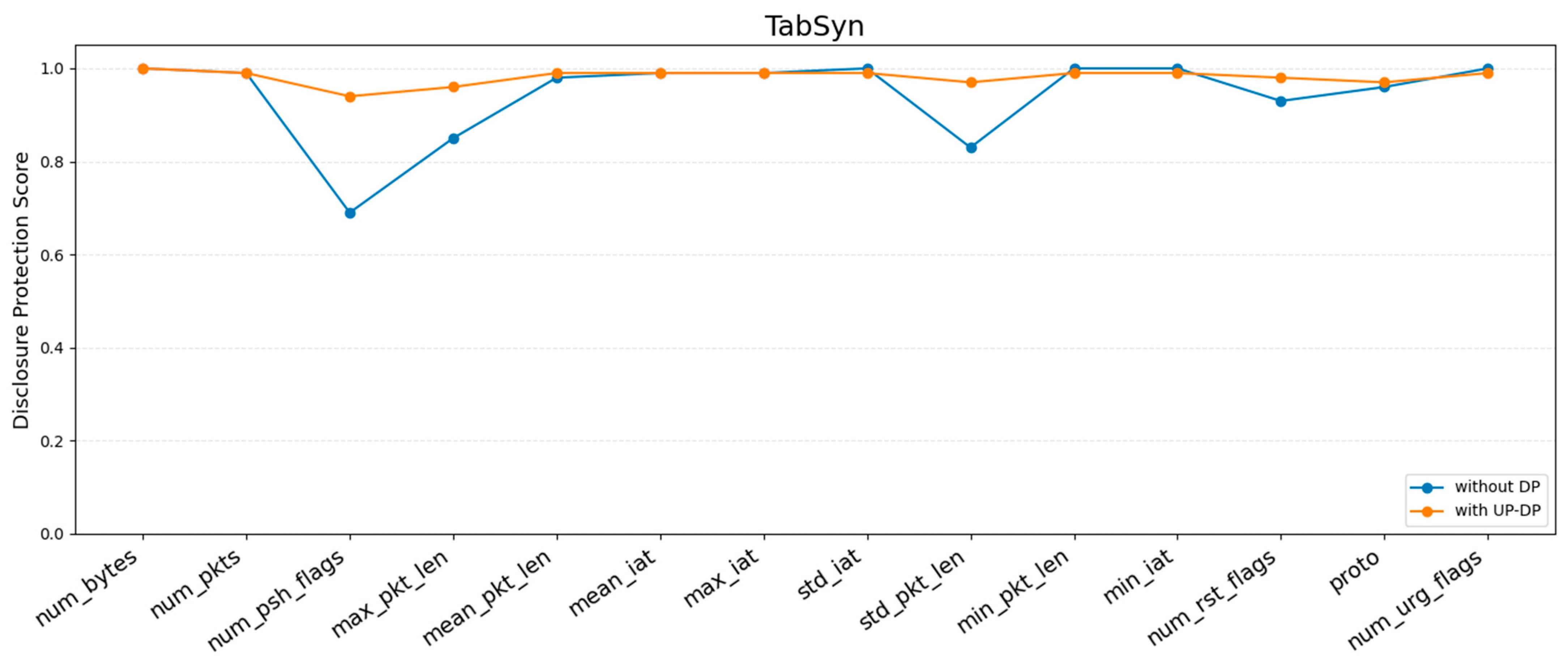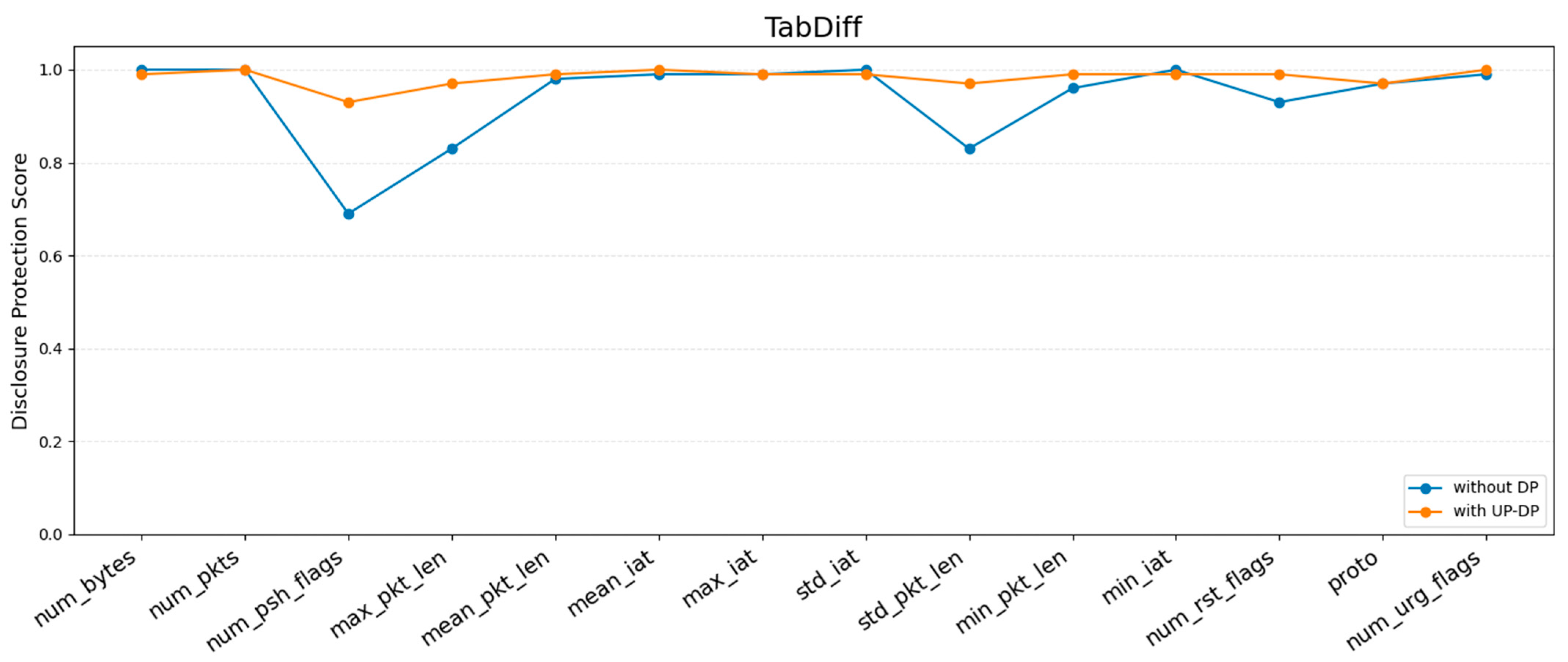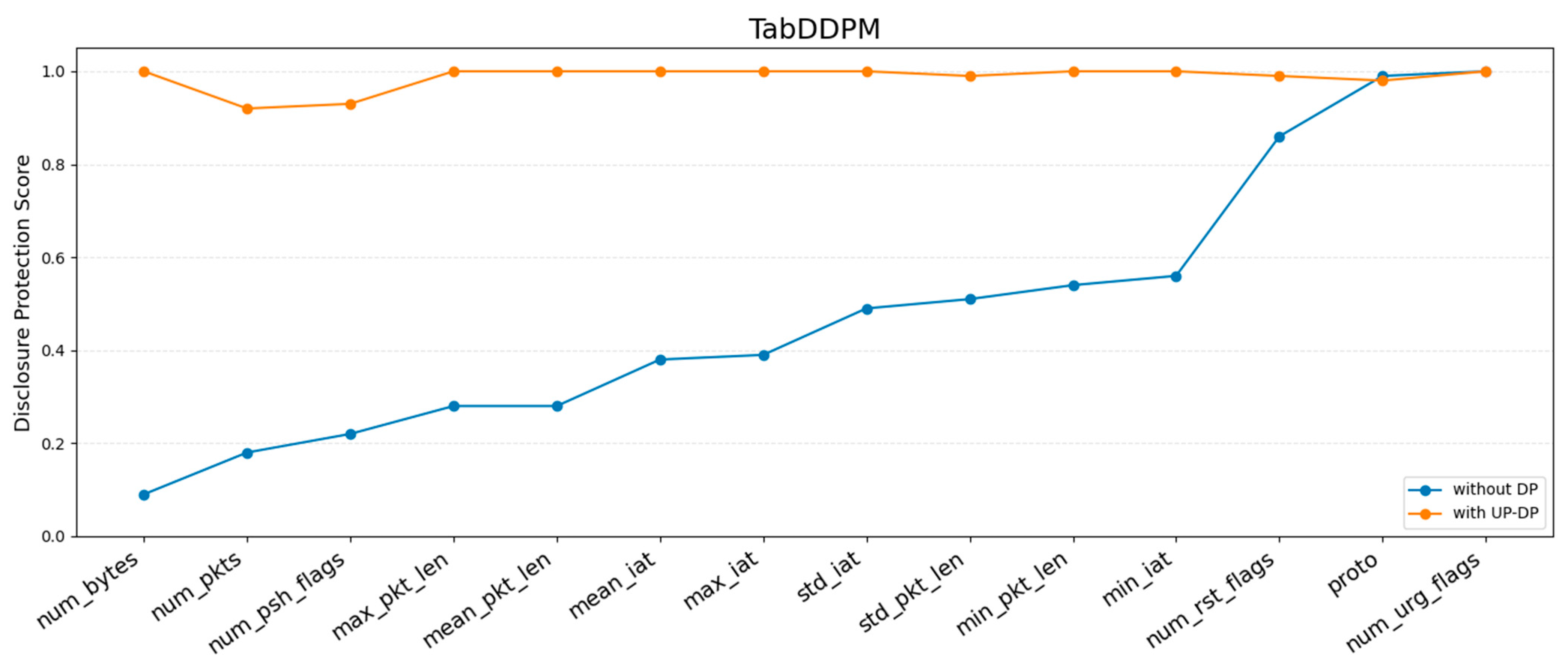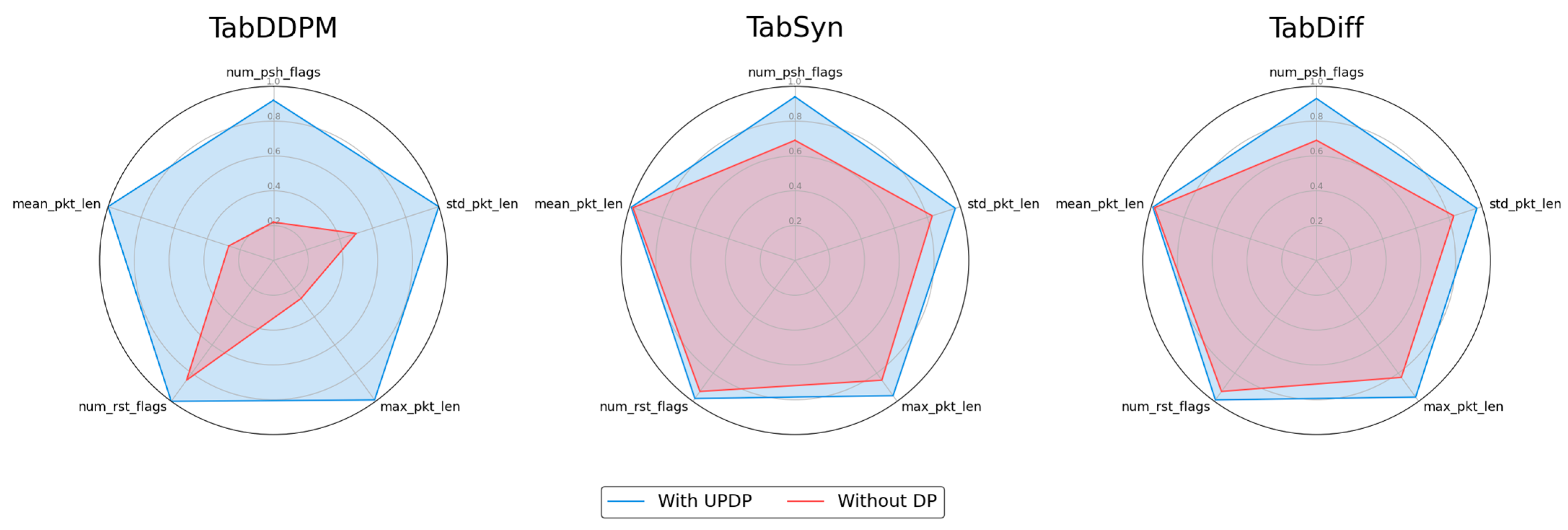 6] proposed Utility-Preserving DP (UP-DP), which maintains the trade-off between utility and privacy, to preserve the semantics of the real data while protecting against privacy risk. Applying this to a CT-GAN generated high-quality IoT network data. Comparing the statistical metrics before and after applying DP, this approach minimized the difference in utility and showed better defense performance in privacy risk. However, GAN-based approaches have structural limitations: mode collapse, where the diversity of outputs drops sharply and only a few outcomes are produced, non-convergence, where training oscillates or diverges instead of reaching equilibrium, and instability that arises when gradients vanish. To address these limitations, we conducted the same experiment using a tabular based diffusion model with a stable learning method.