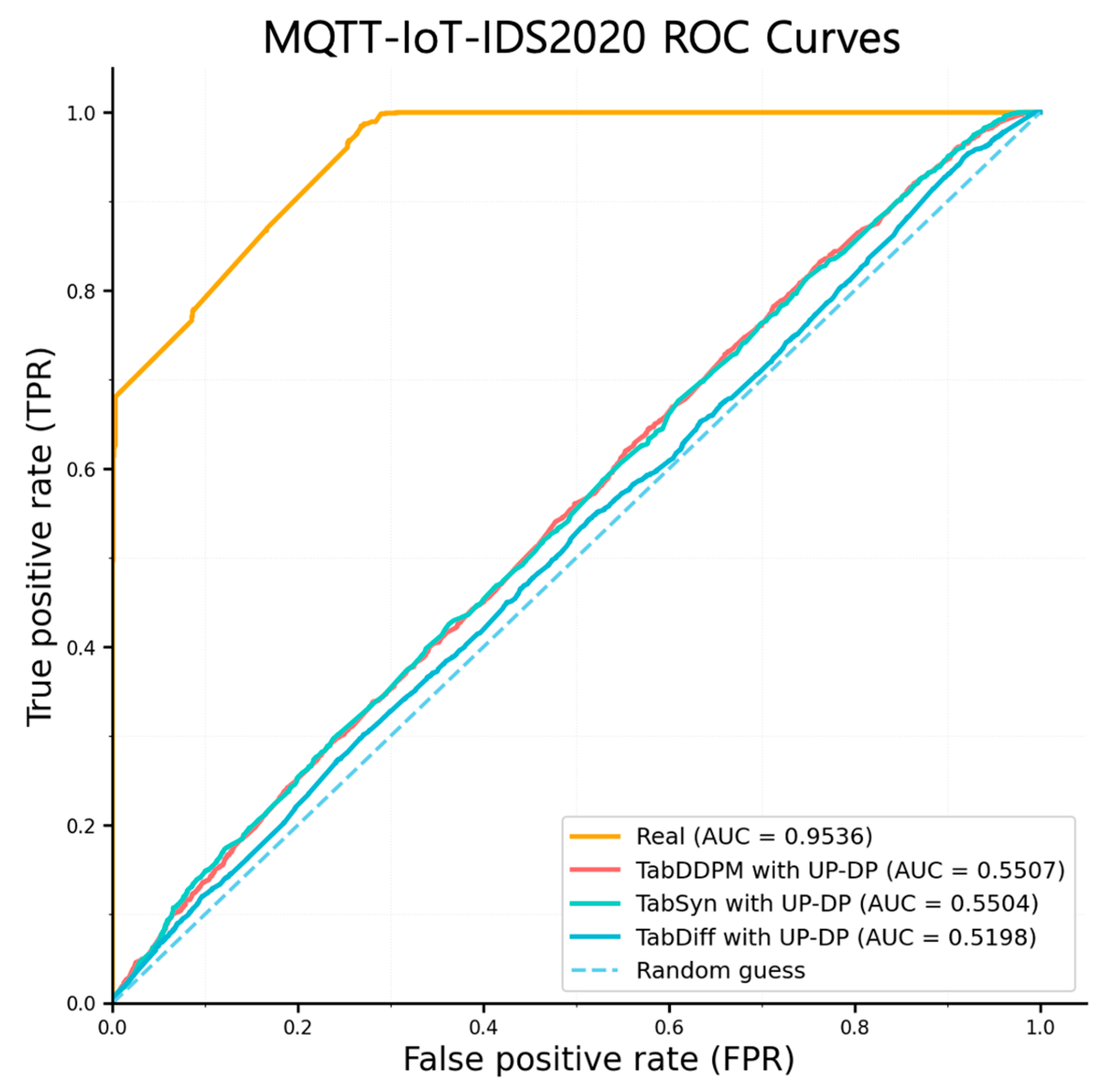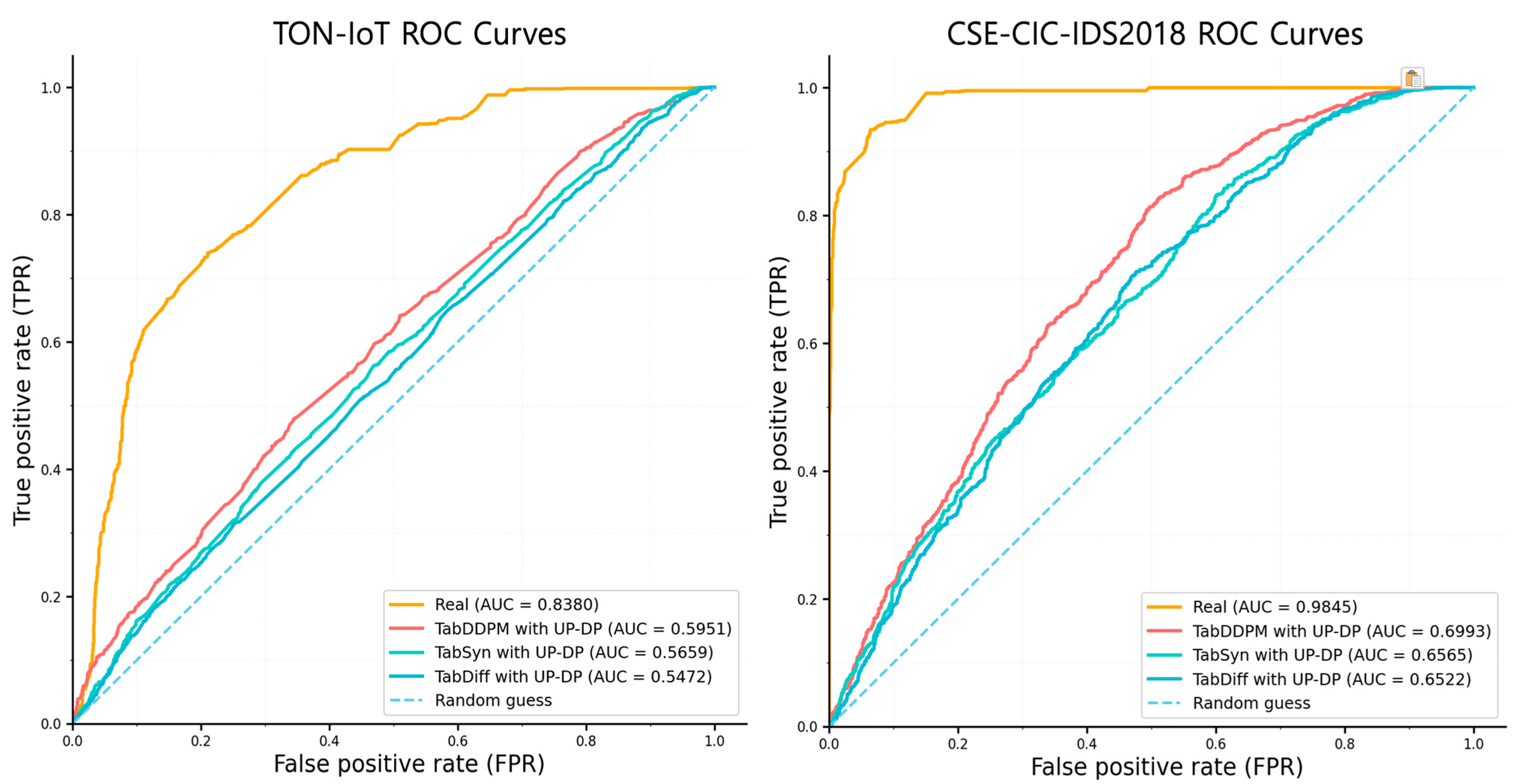 ROC curve results of a MIA on real, TabDDPM, TabSyn, and TabDiff on TON-IoT and CSE-CIC-IDS2018 dataset.