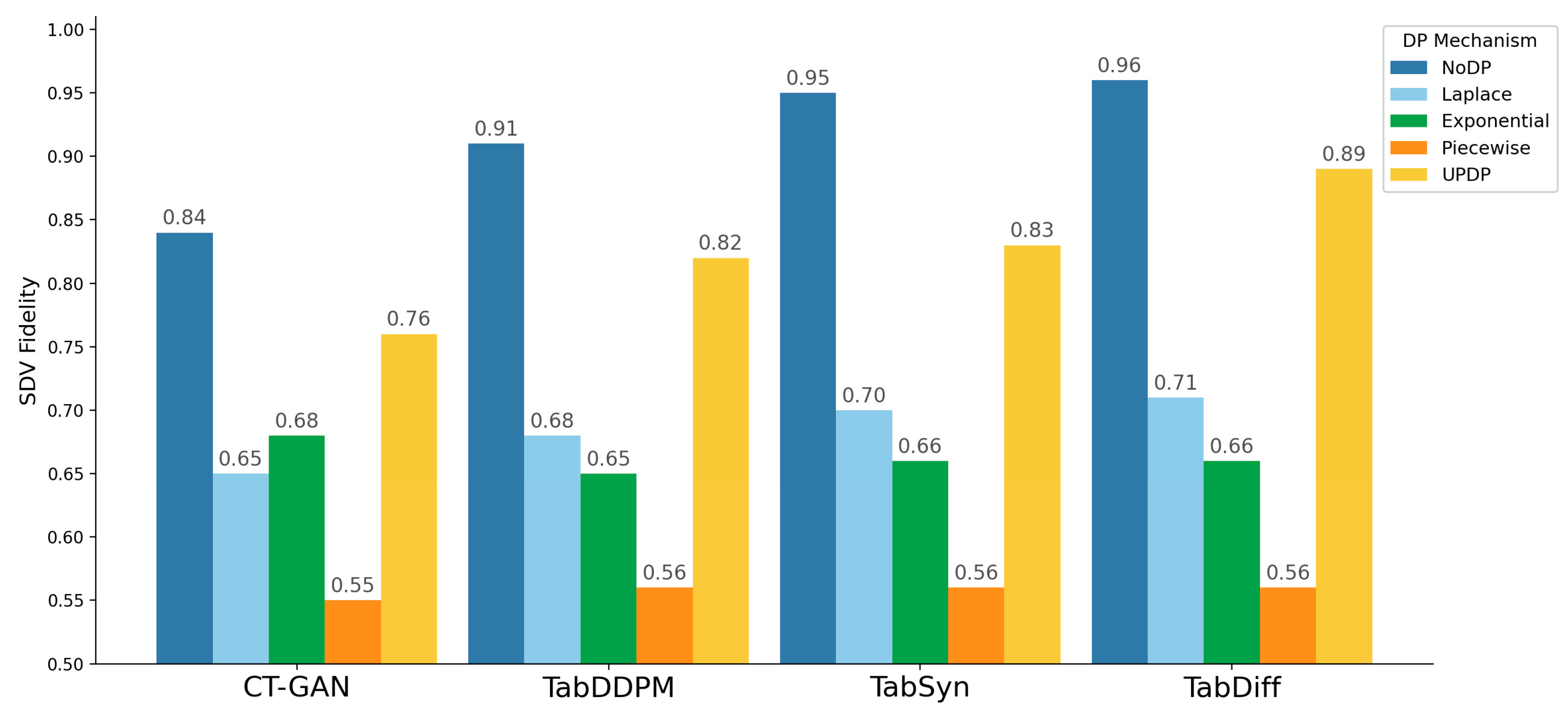 SDV Fidelity when applying DP to TabDDPM, TabSyn, and TabDiff.