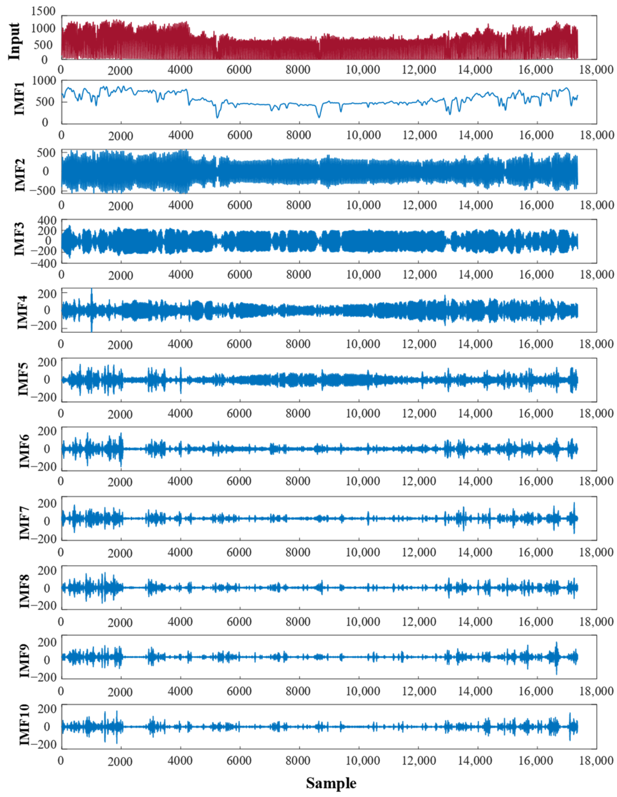 - The photovoltaic power time series is decomposed into K intrinsic mode functions. The mathematical formulation of the decomposition and its associated constraints is as follows: