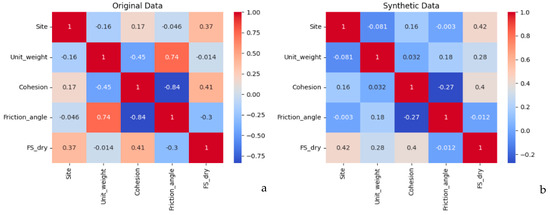 An important consideration in synthetic data generation is whether the augmented samples preserve the physical relationships among soil parameters. In the original dataset, cohesion and internal friction angle exhibited a strong negative correlation (–0.838). We verified that the synthetic data maintained this negative dependency and preserved the overall correlation structure of the original dataset, while domain-driven clipping ensured that all values remained within realistic ranges. Nonetheless, we acknowledge that Gaussian sampling provides an idealized approximation and may not fully capture rare nonlinear dependencies. Future work could address this by adopting multivariate sampling or generative approaches (e.g., generative adversarial networks, GANs) to better preserve complex parameter interactions.