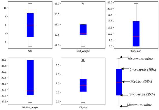 The distribution of the input parameters is illustrated in Figure 3 using box plots, where the horizontal axis represents the attribute, and the vertical axis represents the frequency of each value. These plots highlight the physical conditions of each slope, the variability of the parameters, and the presence of outliers. In a box plot, the bottom whisker represents the minimum value, and the lower edge of the box corresponds to the first quartile (25%); the line inside the box indicates the median (50%); the upper edge represents the third quartile (75%), and the top whisker shows the maximum value, excluding outliers (denoted as small circles). As shown in Figure 3, the median value of the site attribute is 6, which corresponds to the site Mizan-4, indicating that the middle portion of the dataset mainly comes from this landslide section. For unit weight and FS dry, some outliers are observed at the upper end of the distribution.
