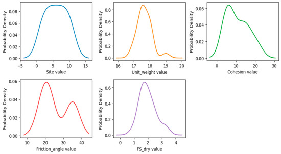 The overall distribution and patterns of the variables provide insight into the characteristics of the dataset, as depicted in Figure 4 using a density plot. As observed, the categorical variable site shows a roughly uniform distribution, indicating balanced sampling across landslide sites. Among continuous variables, unit weight is slightly right-skewed, reaching a peak around 17–18, while cohesion and friction angle exhibit bimodal distributions, suggesting the presence of distinct soil groups or site-specific conditions. FS dry, representing the factor of safety under dry conditions, is roughly unimodal, peaking near 2, which indicates that most slopes are moderately stable.