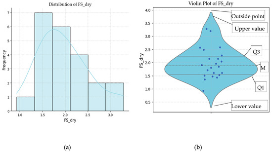 Distribution of safety factors in dry conditions: (a) histogram, (b) violin plot. Where Q1 is the first quartile, M is the median, and Q3 is the third quartile in the violin plot.