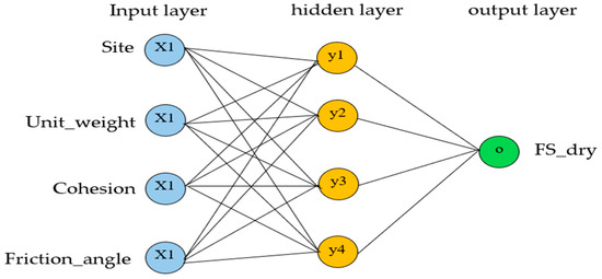An ANN can learn patterns from data, associate new inputs with existing knowledge, and generate predictions while showing robustness to errors in the training set [55]. SNN is a neural network model with one hidden layer, capable of learning complex nonlinear relationships between input features and the target variable [56]. A sample SNN architecture is depicted in Figure 6. By adjusting the weights of connections between neurons during training, the ANN can model subtle patterns in the data, which is useful for predicting the dry factor of safety (FS dry). Although less interpretable than tree-based models, a shallow ANN requires less computational power than deep neural networks, making it suitable for small datasets while still capturing important nonlinear interactions among features.