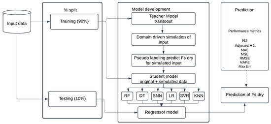 The flow of the proposed method is depicted in Figure 7. The proposed method follows a teacher–student knowledge transfer framework to improve the prediction of FS dry. Initially, the input dataset is split into training (90%) and testing (10%) sets. A teacher model (XGBoost) is trained in the original training data and used to simulate domain-driven inputs, generating pseudo-labeled data. This augmented dataset, combining original and simulated samples, is then used to train a student model. Various regression algorithms, including RF, DT, SNN, LR, SVR, and KNN, are applied to identify the best-performing predictor. The trained student model serves as a regressor for predicting FS dry on unseen testing data, and performance is evaluated using metrics such as R2, Adjusted R2, MAE, MSE, RMSE, MAPE, and Max Error. This approach leverages pseudo-labeling to enhance generalization and achieve more accurate predictions by integrating both real and simulated data.