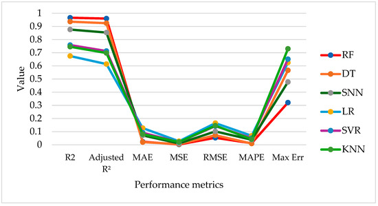 In Table 4, using the train–test split, the RF model achieved the highest predictive performance, with an R2 of 0.9663, an adjusted R2 of 0.9600, and the lowest error values (MAE = 0.0233, RMSE = 0.0531, and MAPE = 0.0116). Decision tree and SNN models also showed good performance but were slightly less accurate than RF. LR, SVR, and KNN exhibited comparatively lower predictive accuracy, with R2 values below 0.76 and higher error metrics. The result of this study using the five-fold cross-validation is shown in Table 5.