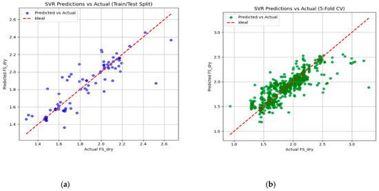 As can be seen in Table 5, the results of the five-fold cross-validation showed similar trends, with RF remaining the model that performed the best (R2 = 0.9281, adjusted R2 = 0.9269). Some models, such as DT and SNN, maintained good performance, while LR, SVR, and KNN showed lower predictive accuracy. The maximum errors were generally higher in cross-validation compared to the simple train–test split, indicating that some predictions deviated more from the actual values when the models were tested in multiple subsets. The comparison of results in the train–test split is shown in Figure 8. The SVR result of the split test train is depicted in Figure 9.