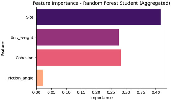To better understand the contributions of individual parameters, an aggregated feature importance analysis was performed for the RF Student model. All one-hot encoded site variables were combined into a single “site” feature. The resulting feature importances are site (0.416), cohesion (0.284), unit weight (0.277), and friction angle (0.023). These results indicate that site information, cohesion, and unit weight are the most influential factors for predicting FS dry, while friction angles play a minor role. Figure 10 shows the corresponding feature importance graph, where the horizontal axis represents the value of the attribute importance, and the vertical axis represents the name of the attribute. This analysis enhances interpretability by highlighting the key geotechnical parameters driving slope stability predictions. A comparison of our study with previous work is presented in Table 6.