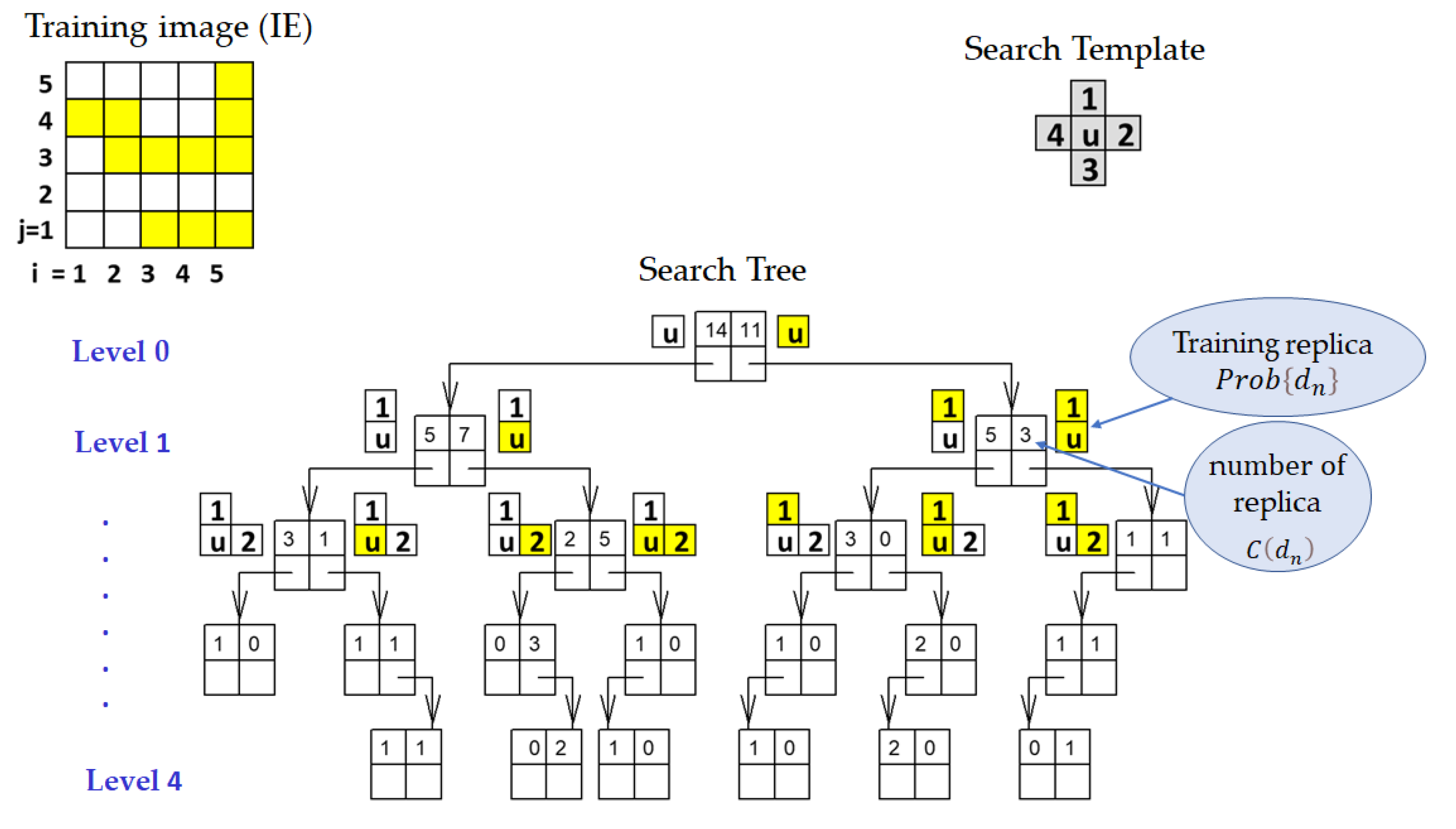 - Strebelle, S. Sequential Simulation Drawing Structures from Training Images. Ph.D. Thesis, Stanford Center for Reservoir Forecasting, Stanford University, Stanford, CA, USA, 2000; p. 24, UMI Number: 3000105. Available online: https://github.com/SCRFpublic/snesim-standalone/blob/master/snesimtheory.ppt (accessed on 10 April 2024).