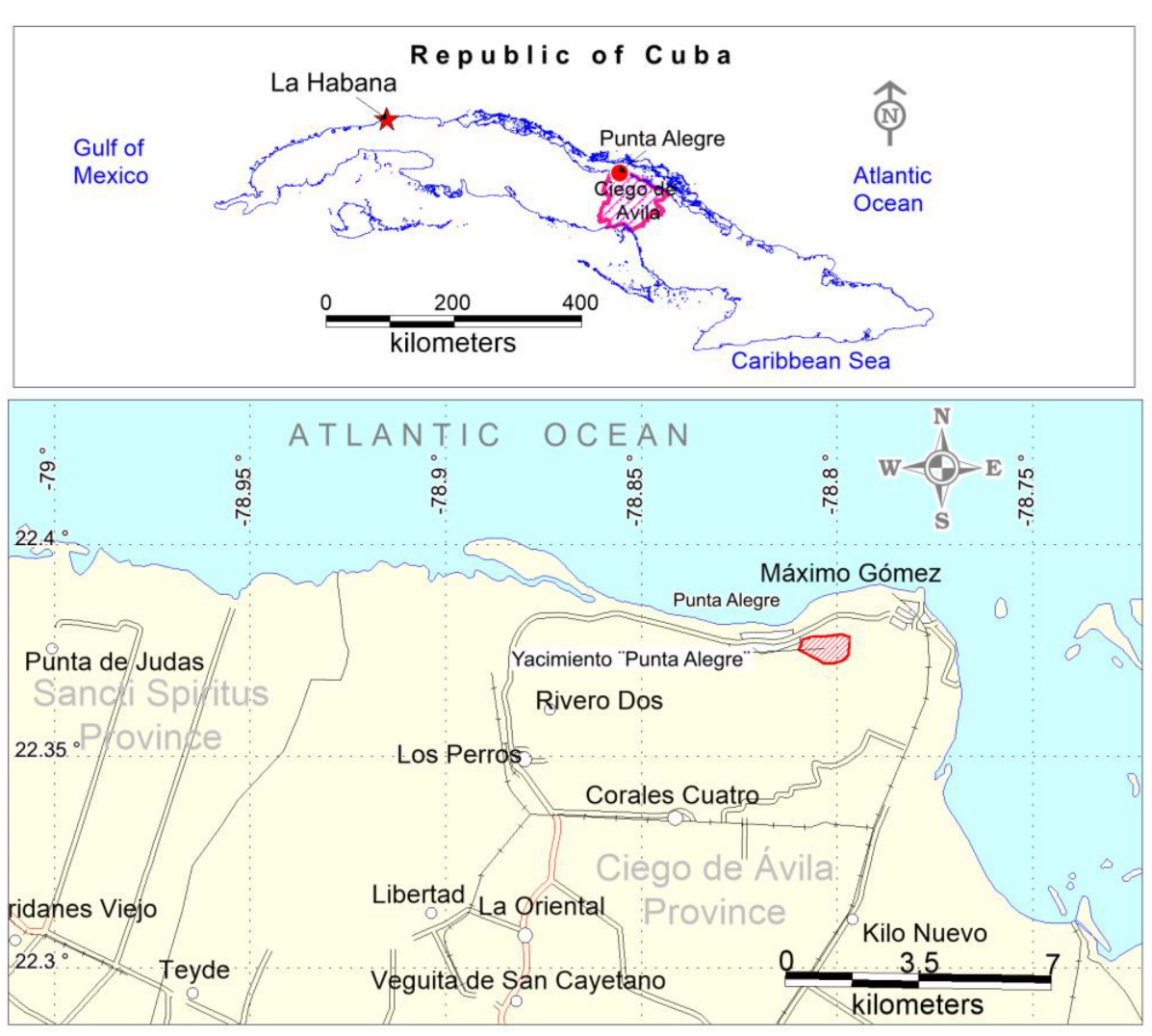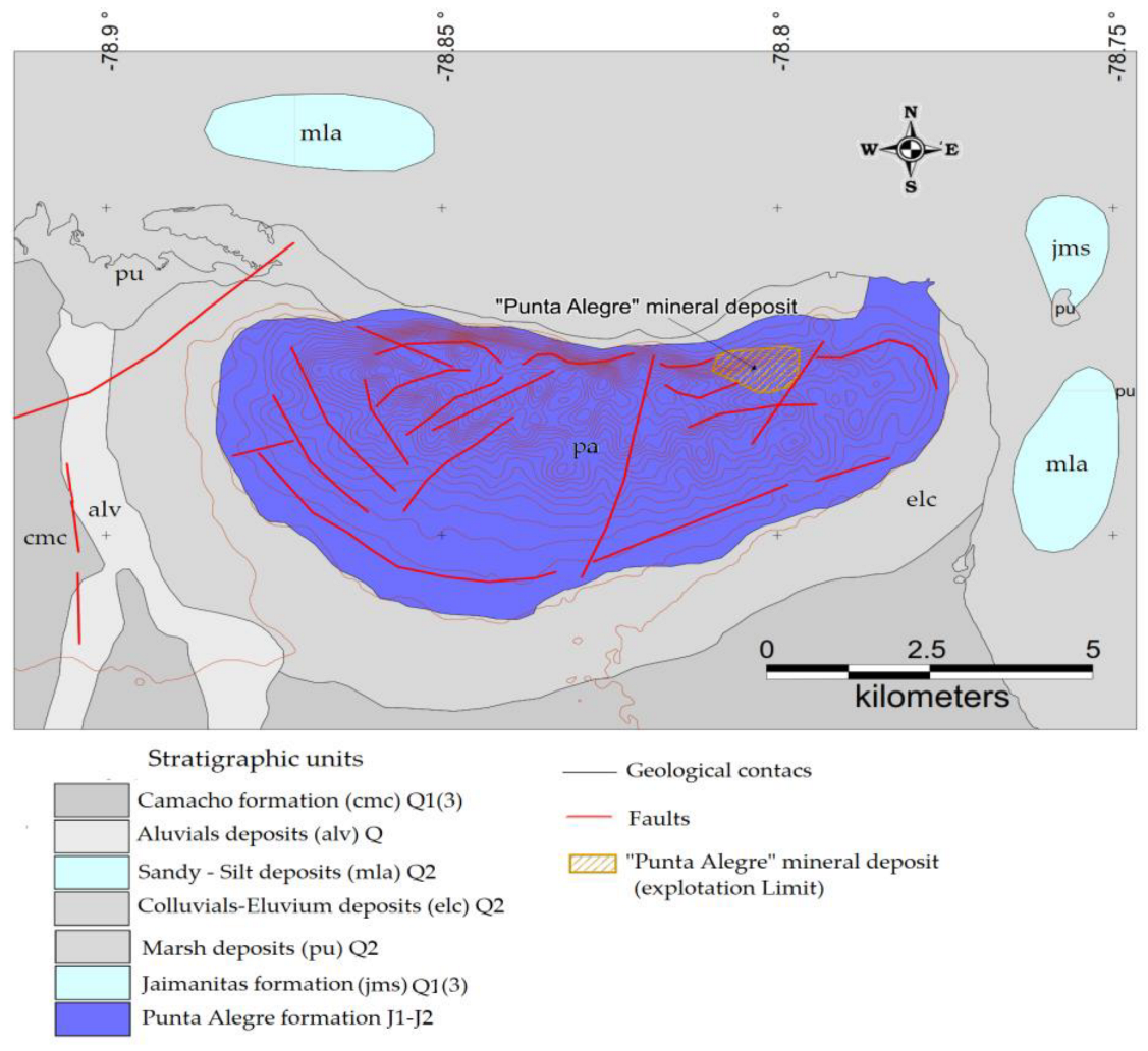 - Instituto de Geología y Paleontología of Cuba. Mapa Geológico Hoja Punta Alegre a Escala 1:100000; 2011.a ed.; Internal Report; Instituto de Geología y Paleontología (Cuba): La Habana, Cuba, 2011; Available online: https://www.igp.minem.cu/ (accessed on 16 February 2024).