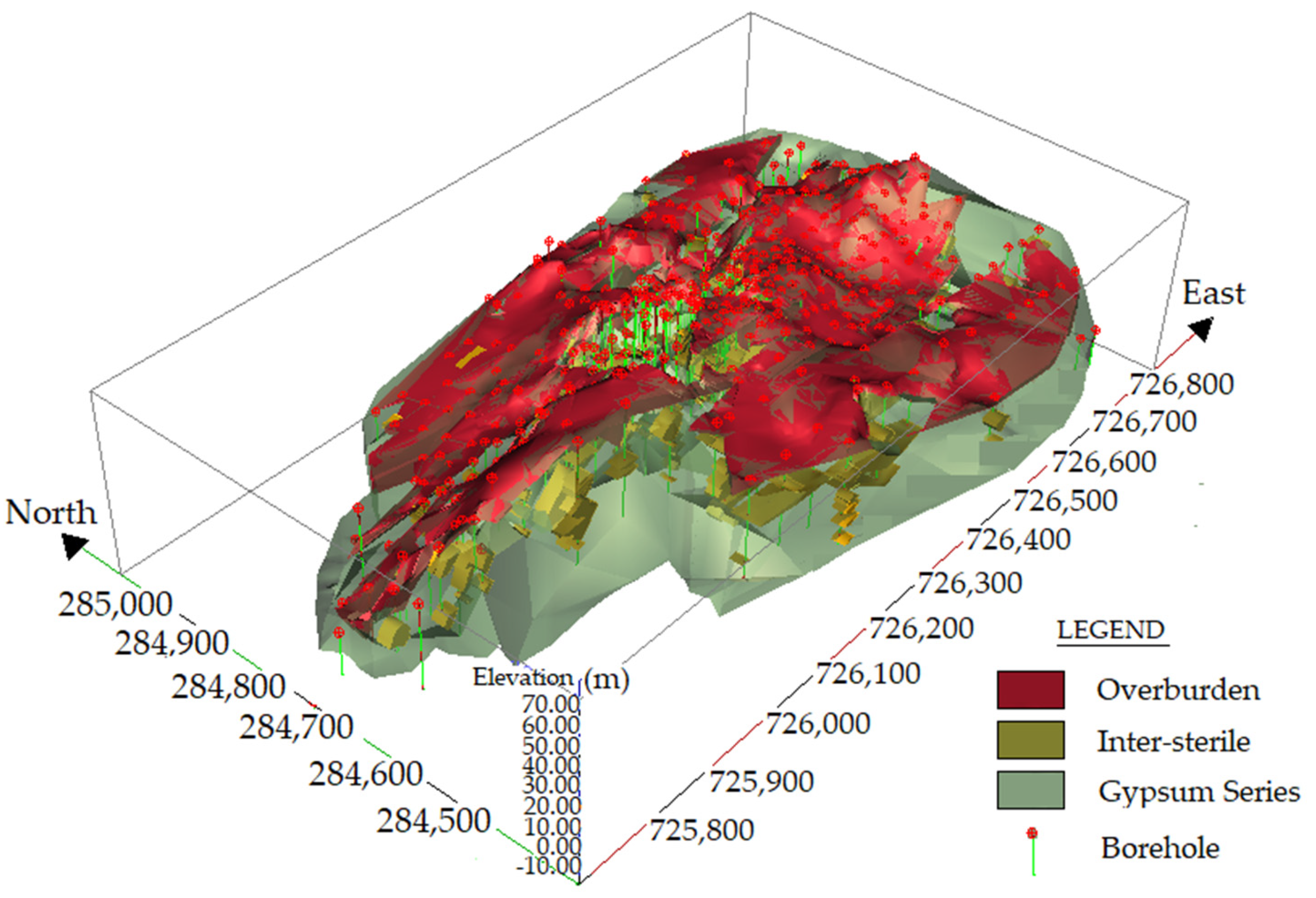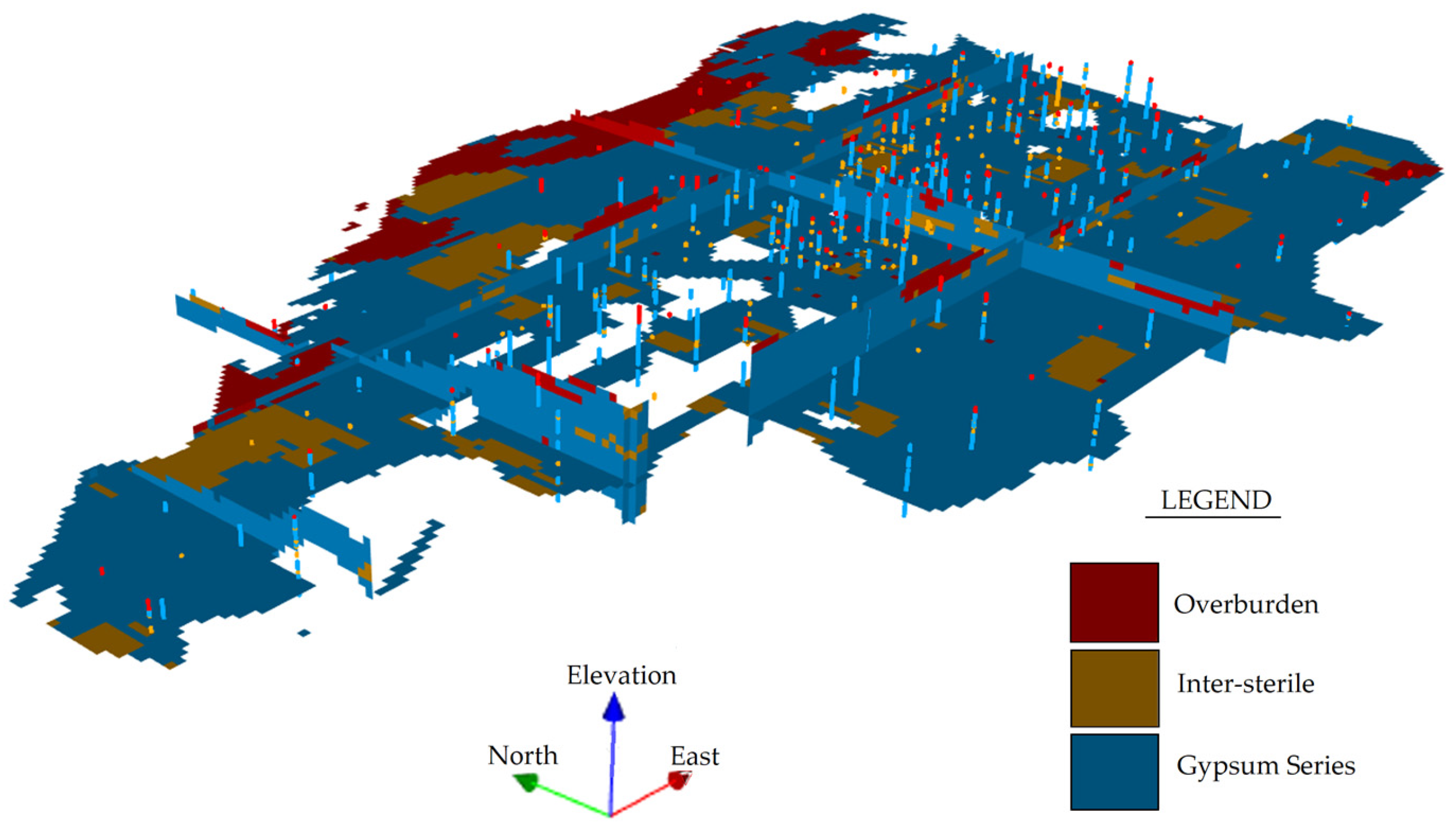 - Júnior, S.; da Silva, A.A. Simulação de Litotipos de Depósito de Minério de Ferro com Geoestatística de Múltiplos Pontos. Master’s Thesis, Universidade Federal Do Rio Grande Do Sul. Programa de Pós-Graduação em Engenharia de Minas, Farroupilha, Brasil, 2013; p. 102. Available online: https://lume.ufrgs.br/handle/10183/79828 (accessed on 16 February 2024).