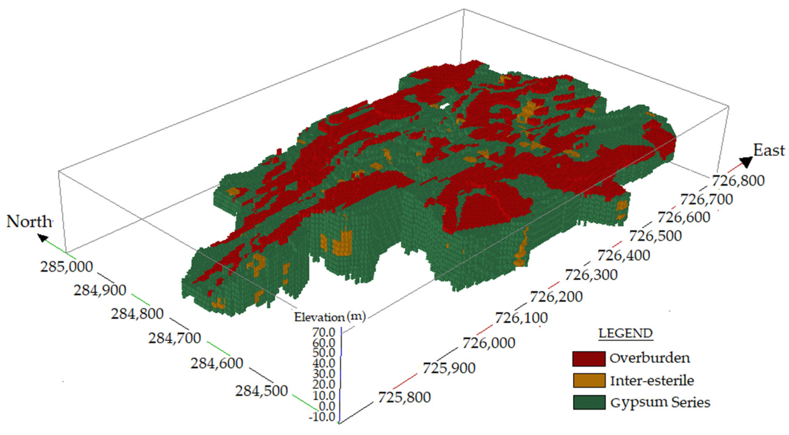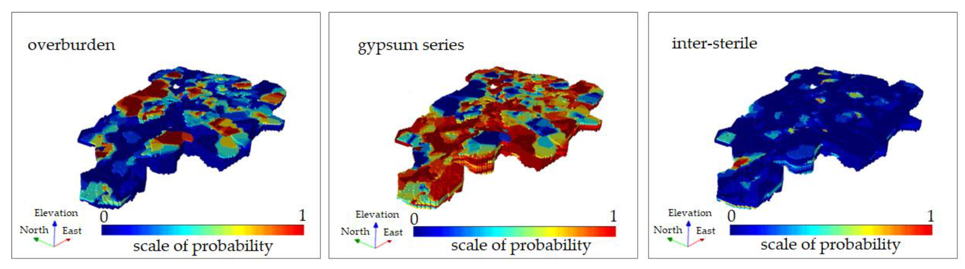 3.2.6. Prior Probability Maps of the Overburden, the Valuable Mineral (Gypsum) and the Intercalated Sterile (‘Inter-Sterile’)