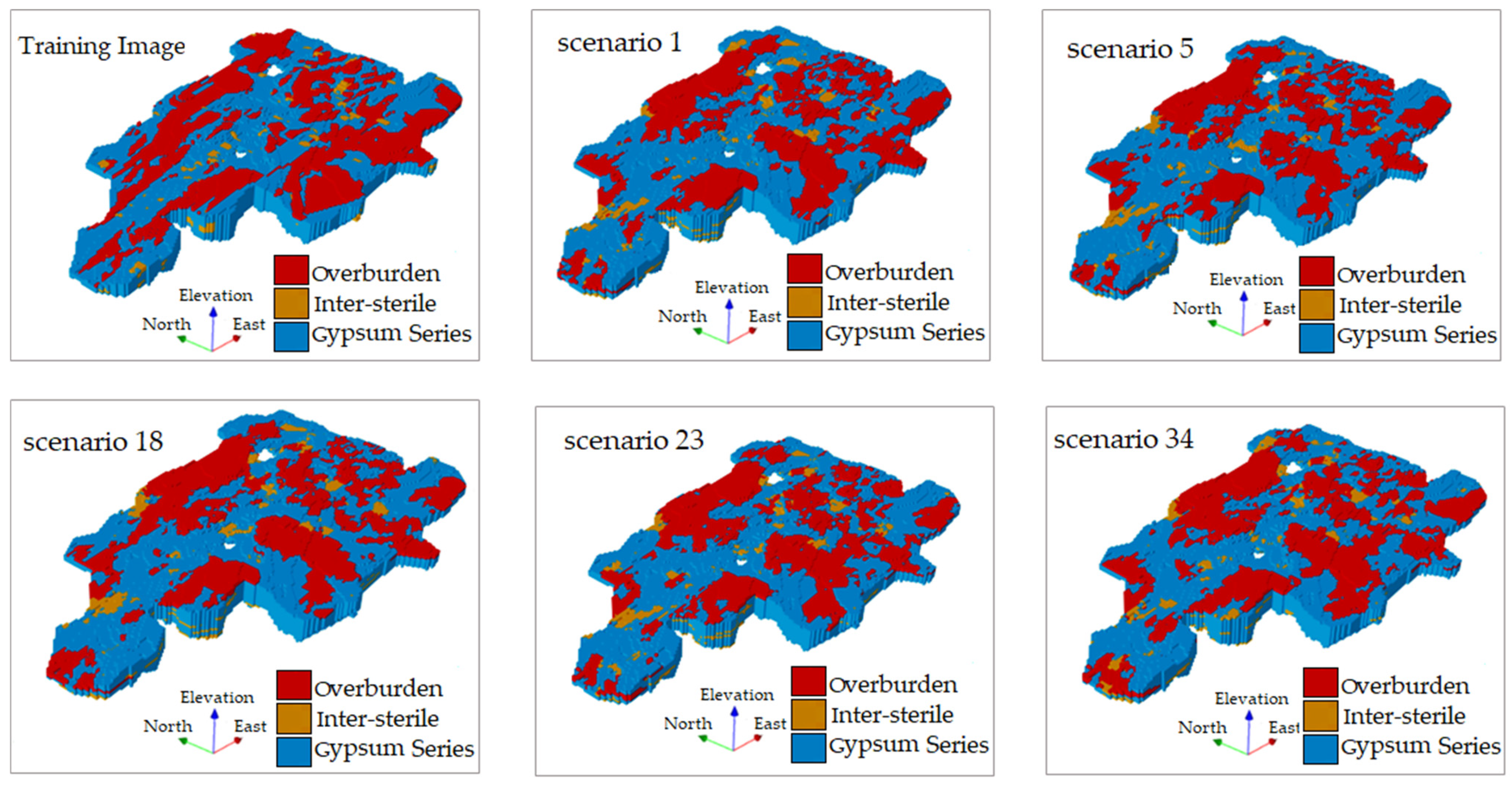 - Osterholt, V.; Dimitrakopoulos, R. Simulation of Orebody Geology with Multiple-Point Geostatistics—Application at Yandi Channel Iron Ore Deposit, WA, and Implications for Resource Uncertainty. In Advances in Applied Strategic Mine Planning; Dimitrakopoulos, R., Ed.; Springer: Cham, Switzerland, 2018; pp. 335–352. [Google Scholar] [CrossRef]