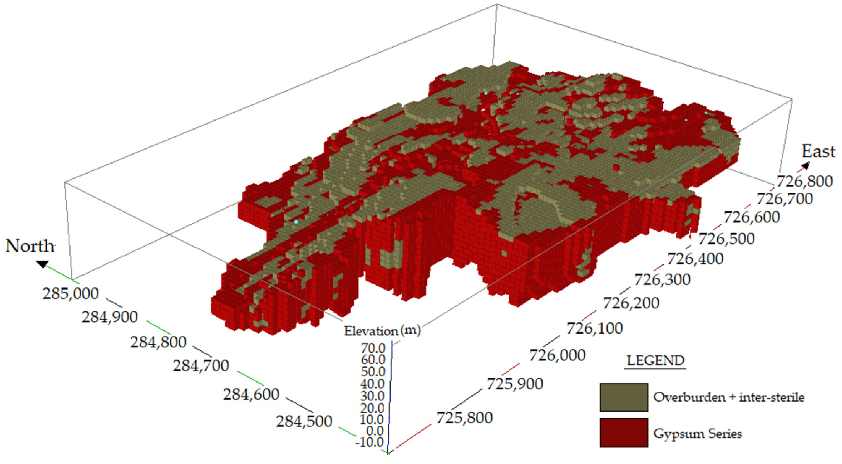 - Ortíz, E. Re-Estimación de Recursos para la Concesión del Yacimiento «Yeso Punta Alegre»; Internal Report No.: 3281; CEPRONIQUEL: La Habana, Cuba, 2018; p. 79. [Google Scholar]