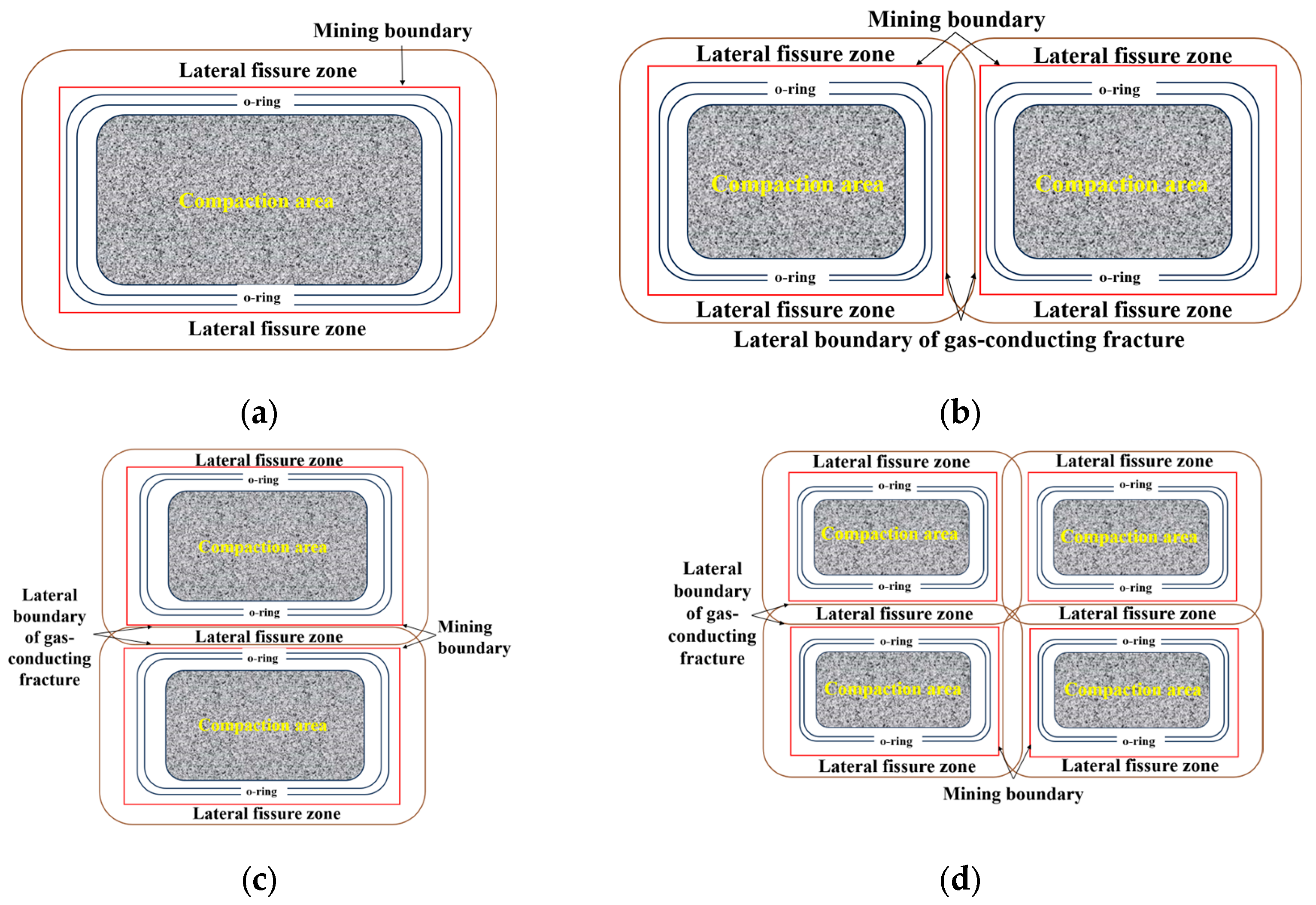 - Yang, Z.B.; Wang, J.C.; Yang, Y.Q.; Qin, Y.; Li, G.F. Spatial division of coalbed methane disturbed reservoir left over from abandoned working face-Taking 12501 working face of Tunlan Coal Mine as an example. Coal Sci. Technol. 2023, 51, 243–255. [Google Scholar] [CrossRef]