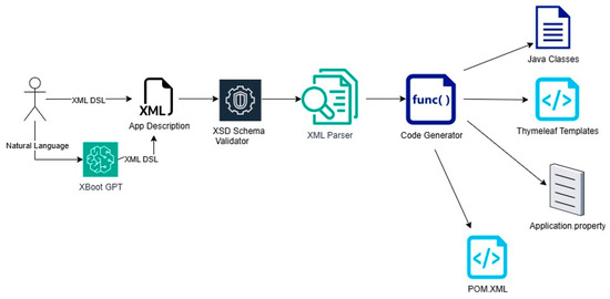 As delineated in Table 2, the architectural components of XBoot collectively address the identified research questions, thereby ensuring comprehensive full-stack generation, integrated security, view support, and traceable code. While this systematic mapping underscores the rigor of XBoot’s design, effective utilization of the DSL necessitates support for students and novice developers who may encounter difficulties with XML syntax and modeling conventions. To address this challenge and further enhance usability, XBoot is supplemented by a custom-trained GPT-based assistant, XBoot GPT [33]. This language model is fine-tuned to understand backend development concepts and can translate informal system descriptions into valid XBoot DSL code. Students and developers can interact with XBoot GPT to rapidly bootstrap their models, reducing time spent on DSL syntax and structure. Importantly, the generated XML is still validated and transformed by the core XBoot generator, ensuring traceability, determinism, and architectural consistency.