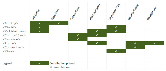 The alignment between the research questions and the architectural components underscores the systematic design of XBoot. Specifically, the XML DSL, Validator, and Parser together address RQ1 by facilitating unified full-stack generation. The Parser and Code Generator address RQ2 by maintaining role definitions and producing secure controllers with Spring Security. Furthermore, the Code Generator’s outputs for REST controllers and Thymeleaf templates correspond to RQ3. Finally, the adoption of standard Spring Boot conventions in entities, services, and configuration files ensures RQ4. These mappings are detailed in Table 2.