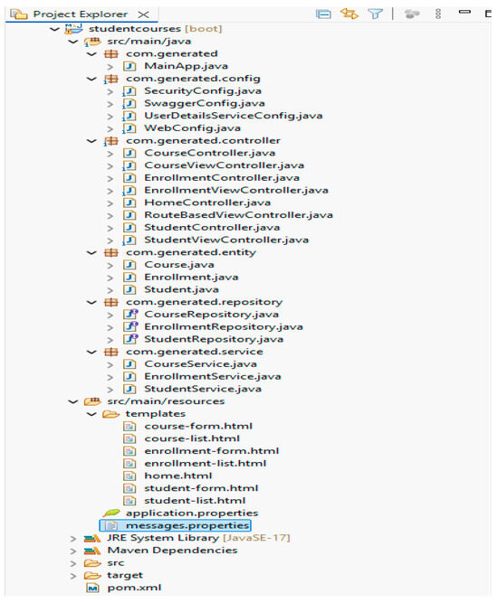 The final stage was the implementation of a processor that parses valid XML specifications and transforms them into Spring Boot code. A Java-based parser interprets the XML input, builds an internal representation of the model, and passes it to modular code generators. Each generator corresponds to one application layer, some of which are: