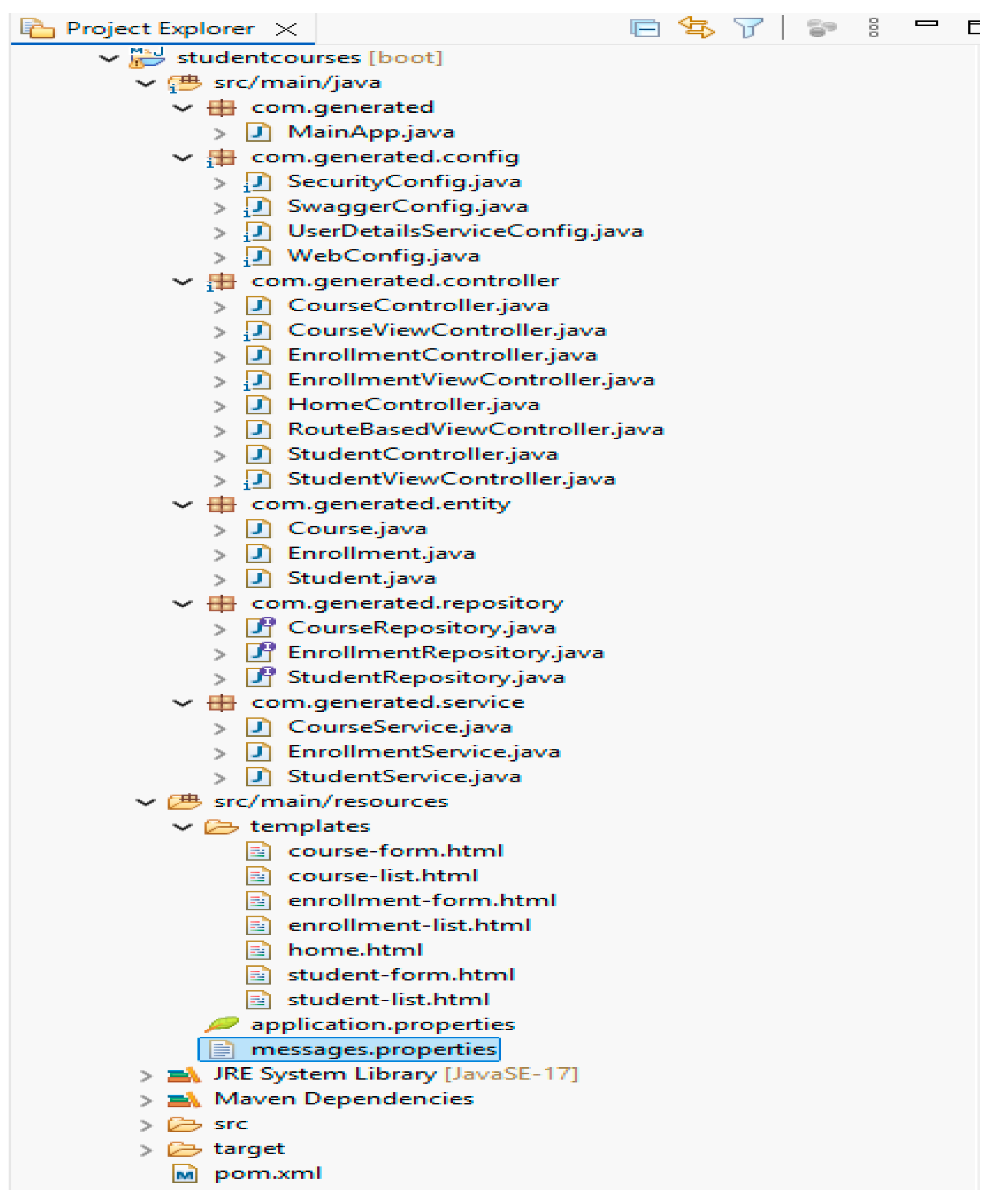 XBoot addresses this challenge by generating applications that consistently follow a layered model with entities, repositories, services, REST and view controllers, and Thymeleaf templates. This scaffolding provides tangible examples of best practices, guiding students toward modular design aligned with established conventions.