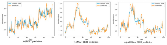 Using the patients’ systolic blood pressure (SBP) data, three predictive models—BERT, BERT combined with Moving Average (MA), and BERT combined with AutoRegressive Integrated Moving Average (ARIMA)—were employed to forecast future SBP values. These predictions were then compared against the actual measured values, referred to as the ground truth. The comparative results are presented in Figure 3 and Figure 4. In each figure, the blue line represents the ground truth SBP measurements, while the orange line depicts the SBP values predicted by the respective model.