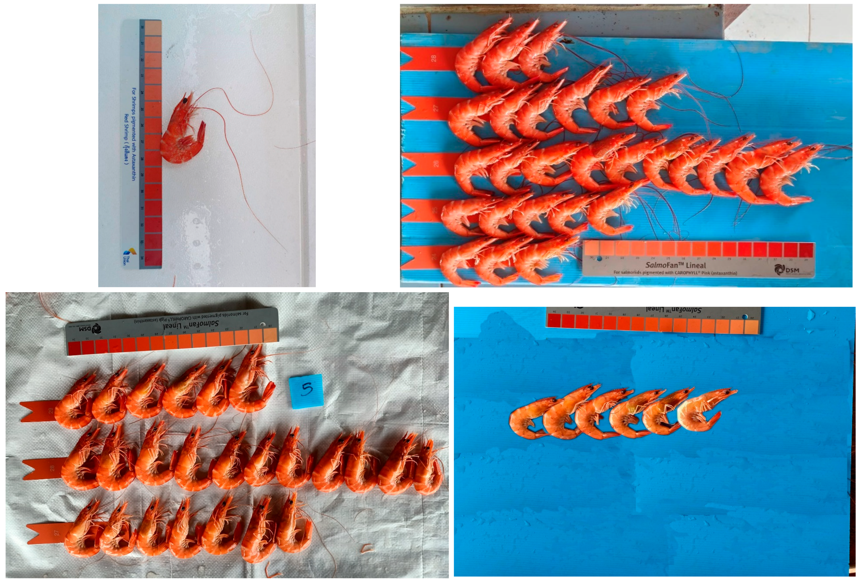 4]. For example, medium-sized shrimp (M) correspond to 91–100 shrimp per kilogram. After weight-based grading, color grading is performed by comparing the shrimp’s color against reference color scales, such as ShrimpFan™ or SalmoFan™, using visual assessment [