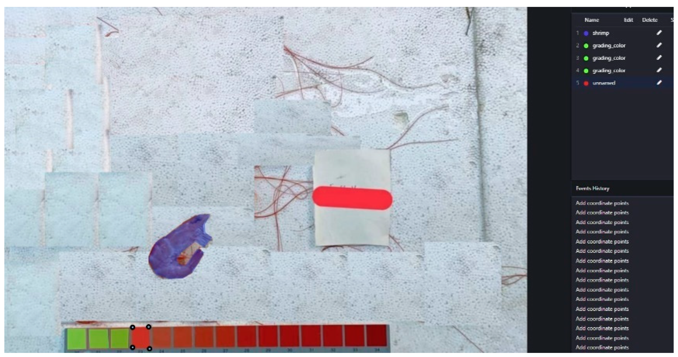 The process of creating image annotations, or ground truth, for segmentation tasks enables artificial intelligence to identify areas corresponding to boiled shrimp, color grading bands in the ruler, and the background. During this phase, the ground truth is manually labeled in the shape of polygons by humans using PixLab annotation generator (annotate.pixlab.io, accessed on 20 August 2025). Annotations must be generated for all original images (800 in total), as illustrated in