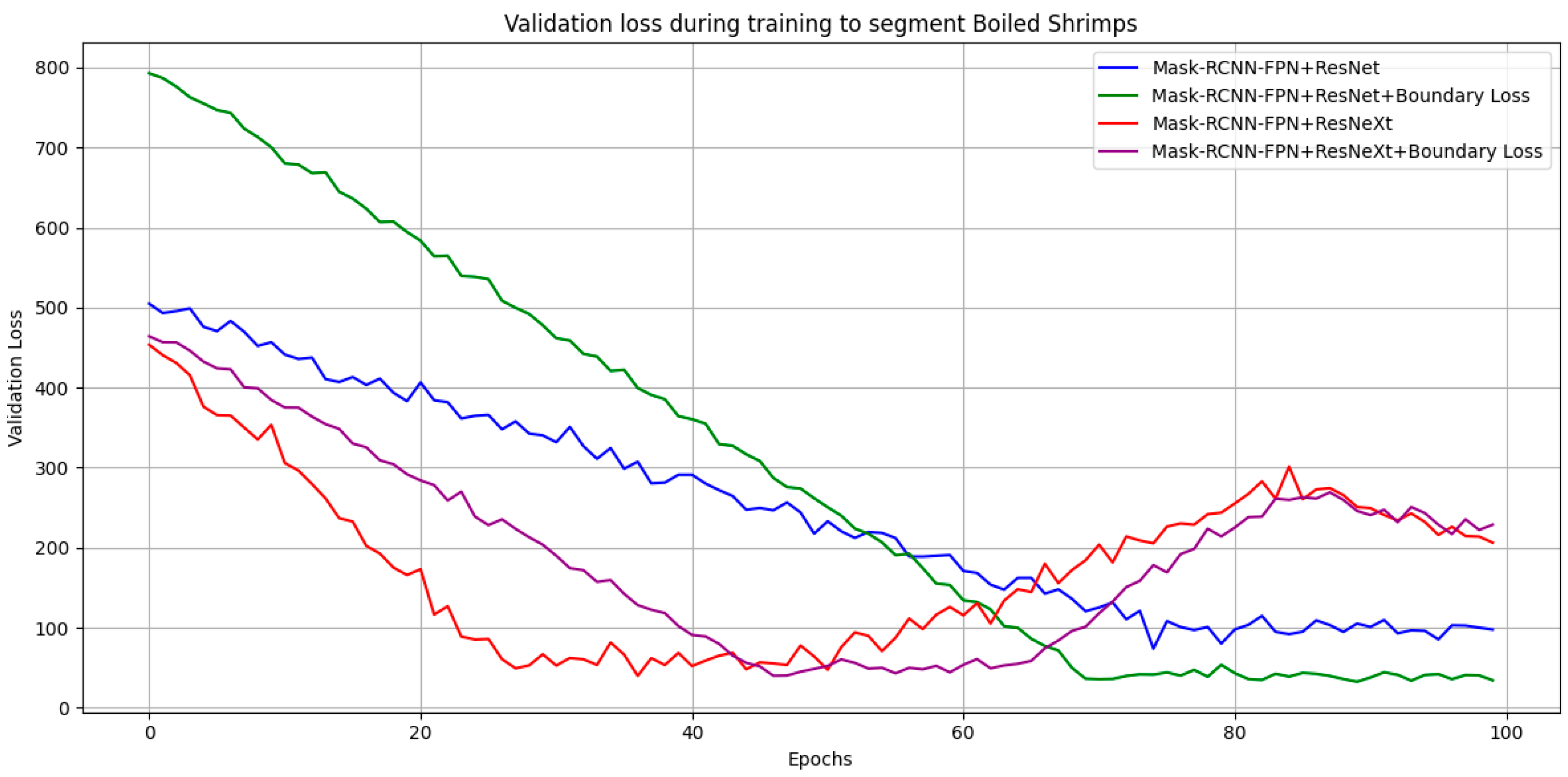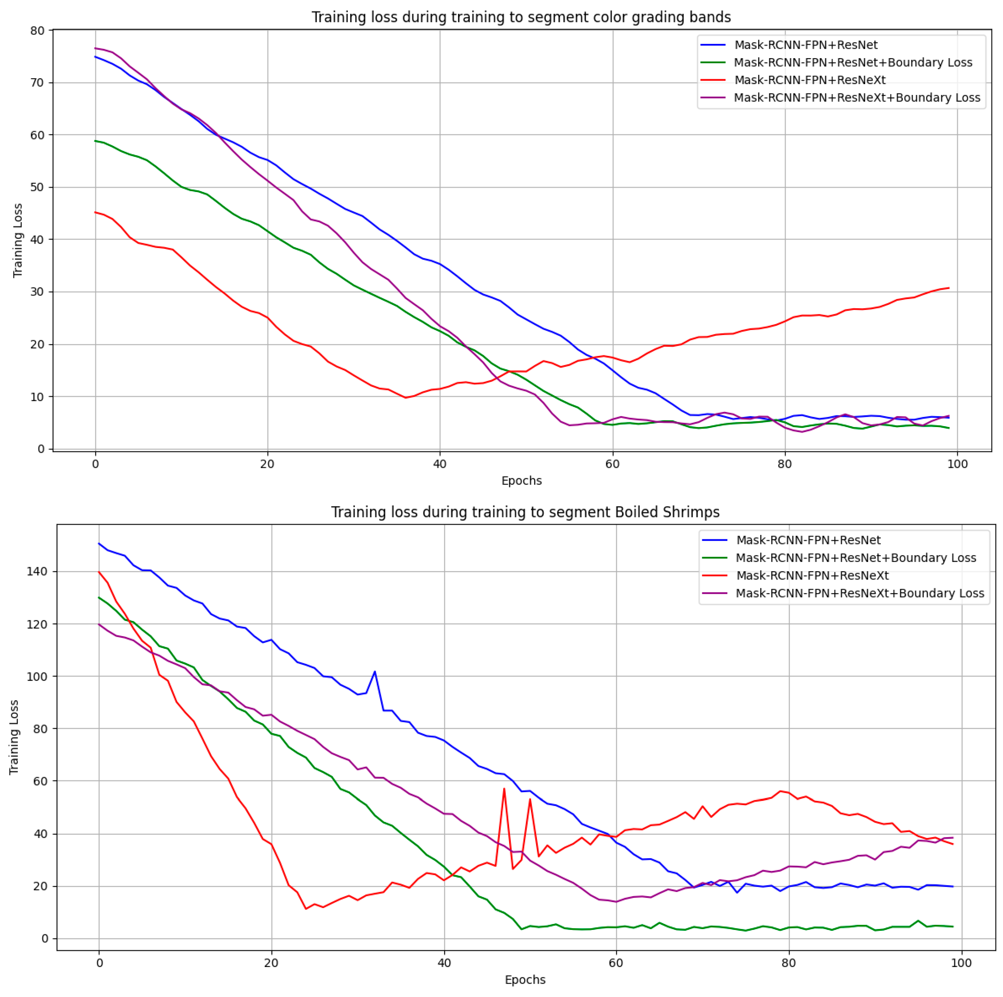 Challenges in automated shrimp grading include overlapping issues such as morphological and color similarities among objects, which are often closely packed or overlapping (e.g., boiled shrimp and color reference scales in an image). These issues make segmenting and labeling objects in computer vision (defining which class each pixel belongs to and identifying the number for each object) more difficult. Instance segmentation, which is a deep learning method that integrates segmentation and object detection in a network, is a promising solution for those challenges since it uses a unified framework that allows the network to leverage shared features across tasks. Unlike separate networks that may suffer from fragmented learning, where segmentation focuses on pixel-level accuracy without instance differentiation, and labeling depends on post-processed outputs that might already include errors, instance segmentation jointly optimizes segmentation and detection, minimizing the propagation of intermediate errors. Shen et al. (2022) [