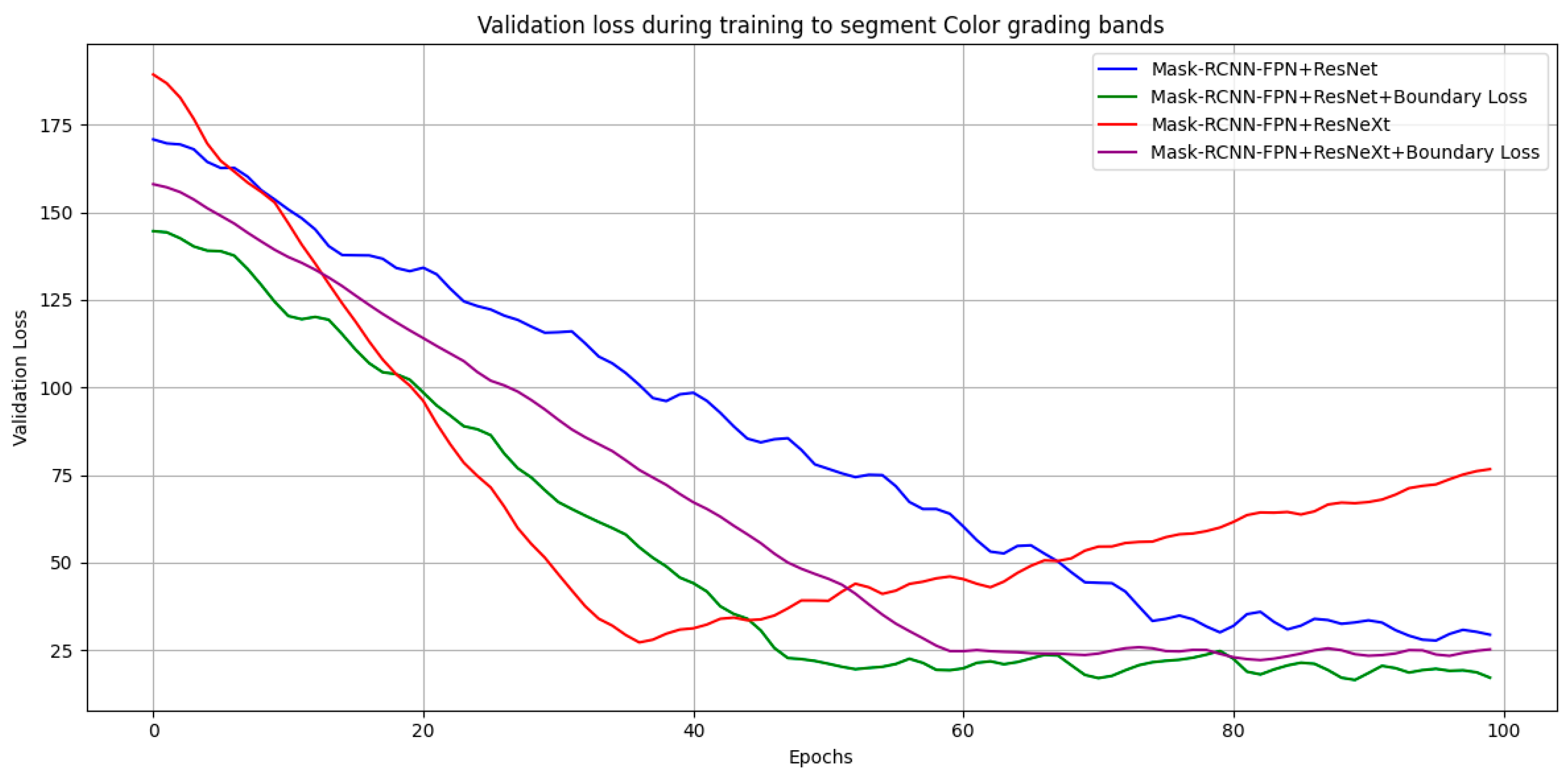 10] demonstrated that a Mask R-CNN Feature Pyramid Networks (FPN) with a ResNet-50 as backbone effectively segmented grape bunches compared to other instance segmentation models. The Mask R-CNN model [