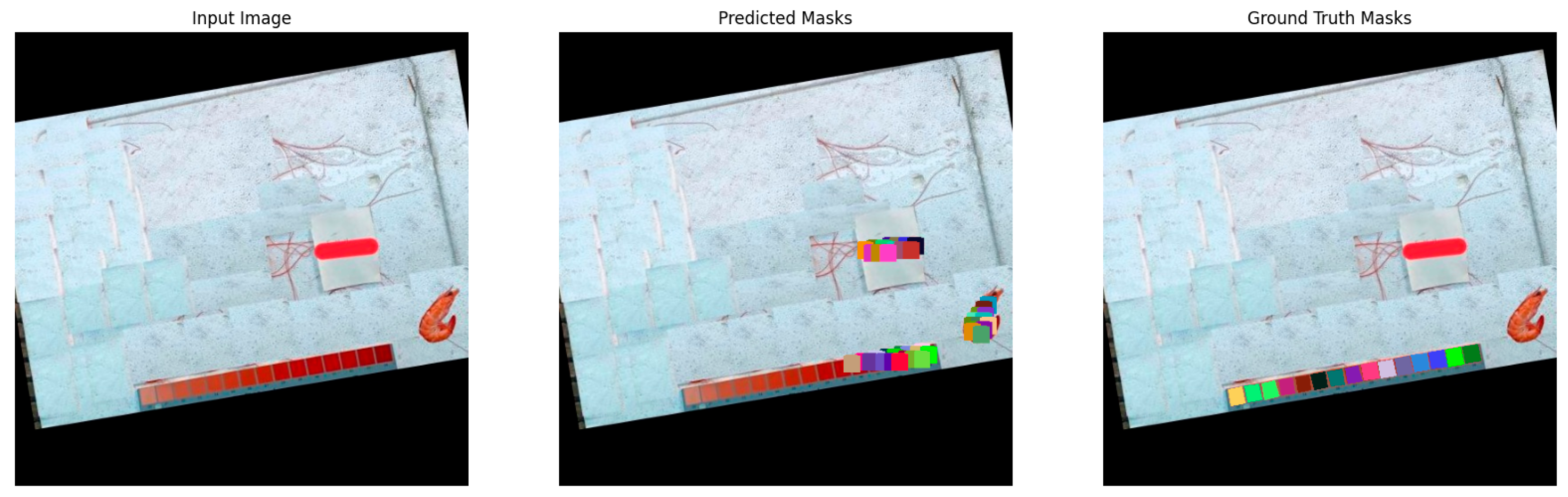 The performance of shrimp and color grading band segmentations is evaluated using the Intersection over Union (IoU) metric. IoU is particularly suited for this research because it addresses class imbalance, a significant challenge in this problem where the majority of the image consists of background pixels, and the regions of interest (shrimp and grading bands) occupy only a small fraction of the image. The predicted masks of shrimps and grading band from the segmentation part in the Mask-RCNN and the ground truth in the form of binary images were used to calculate the IoU as the following: