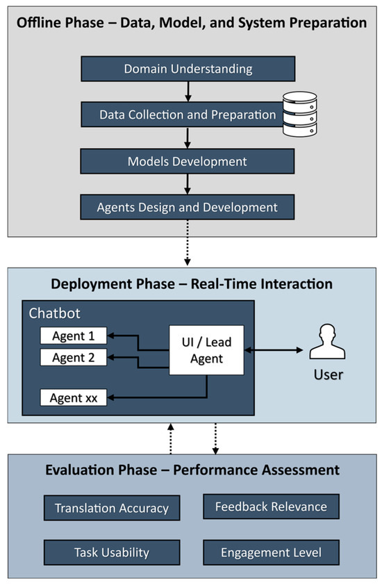 - Offline Phase: This phase involves domain understanding, data collection and preparation, the development of models, and the design of agents. It establishes the foundational components required for real-time interaction.
