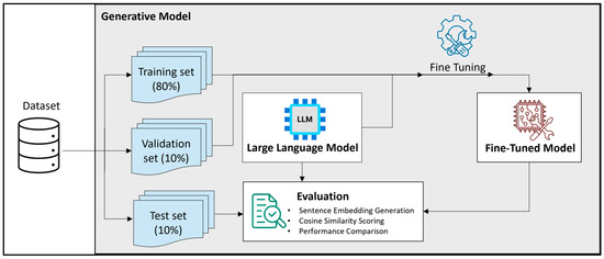 The dataset, previously developed and published in [32], comprises 12,000 English–Arabic sentence pairs curated from the SauLTC. These pairs were pre-processed and formatted in JSONL for use in fine-tuning the generative model. Data was split into training (80%), validation (10%), and test (10%) sets. Fine-tuning was conducted with 3 epochs, a batch size of 32, and a learning rate multiplier of 0.05. The final model achieved stable performance (training loss: 0.300; validation loss: 0.347). The overall workflow of the generative model is illustrated in Figure 2.