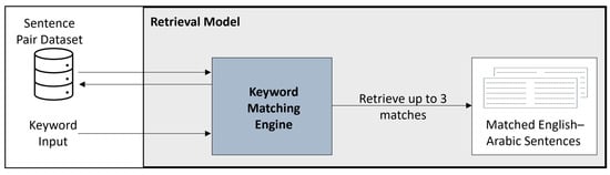 The retrieval model supports example-based learning by returning aligned Eng-lish–Arabic sentence pairs that include user-specified keywords. A keyword-based retrieval method was used, leveraging regular expression matching for full-word identification in the source corpus. Matching English sentences are paired with their corresponding Arabic translations from a curated bilingual dataset. The workflow of this retrieval model is shown in Figure 3.