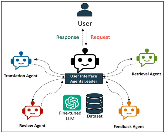 Figure 4 illustrates the system’s interactive flow, where user inputs are processed by a central lead agent and delegated to specialized agents for translation, retrieval, review, or evaluation. The modular structure ensures task-specific handling, real-time responses, and extensibility of system functionalities.