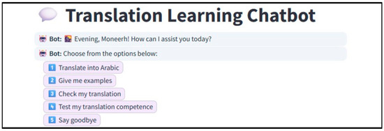 To inform the chatbot’s design, we relied on findings from earlier study [32], which included a series of interviews with faculty members from the Translation Department at Princess Nourah University. These interviews identified four key pedagogical challenges in English–Arabic translation learning: ensuring translation accuracy, promoting contextual understanding, increasing awareness of common translation issues, and enabling competence evaluation. These insights directly informed the functional design of the chatbot.