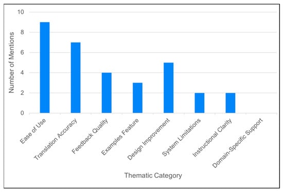 Additional challenges were identified under the themes of “Design Improvement” (5 mentions), “System Limitations” (3 mentions), and “Instructional Clarity” (2 mentions). Suggestions for design improvement focused on enhancing the visual layout and overall interface to boost user engagement. System-related issues included occasional response delays, while instructional clarity concerns reflected the need for better guidance, particularly for new users. Furthermore, “Domain-Specific Support” (1 mention) was suggested by a faculty member, advocating for expansion into specialized translation contexts like medical or legal domains. Figure 7 and Figure 8 present the thematic frequencies for students and faculty, respectively.