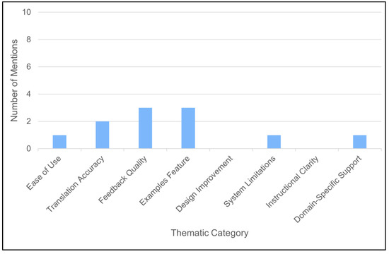 In addition to the Likert-scale responses, participants were invited to provide open-ended feedback on their experience with the Translation Learning Chatbot. These responses were analysed thematically, with answers grouped under broader themes to identify common trends, strengths, and areas for improvement, offering deeper insights into users’ perceptions beyond numerical ratings.