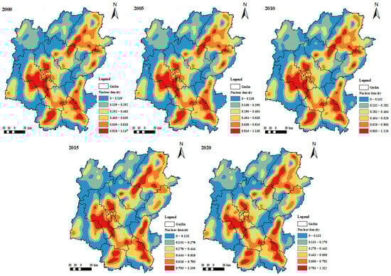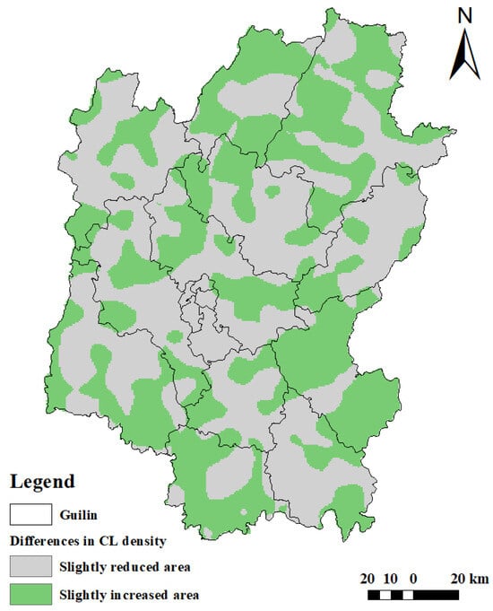 Kernel density estimation reveals that from 2000 to 2020, the spatial distribution of CL density in Guilin consistently exhibited a pattern of higher concentrations in the east and south, and lower in the west and north (Figure 2). Specifically, (1) over the past two decades, the total CL area experienced an overall decline, accompanied by a gradual shrinkage of high-density zones; (2) relatively high-density CL areas were primarily concentrated in the southeastern Lingui District, central Lingchuan County, northwestern Gongcheng Yao Autonomous County, central Quanzhou County, and the southern border of Xing’an County, with the highest densities observed in the northern Xing’an County and southeastern Lingui District (Figure 3).