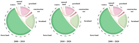 Spatial overlay analysis of land use data from 2000, 2010, and 2020 was used to construct land use transfer chord diagrams for 2000–2010, 2010–2020, and 2000–2020 (Figure 4). The results show that forest land (64.06%) and CL (19.17%) dominate land use in Guilin. During 2000–2010, grassland and CL underwent the most significant changes after construction land. Grassland decreased at an average annual rate of 28.64 km2 with dynamic degrees of −0.08%, mainly in northeastern Quanzhou County, the border of the Xing’an and Quanzhou counties, and northwestern Lingchuan County regions characterized by complex topography, higher elevation, and fragmented CL. CL loss averaged 18.69 km2 per year (dynamic degree: −0.03%), concentrated in Quanzhou, Xing’an, Yangshuo, and Lingui areas with higher mountainous terrain. In contrast, flatter regions with contiguous CL, such as northwestern Lingui and northwestern Xing’an, experienced minimal change. Construction land expanded notably at an annual rate of 24.20 km2, with a dynamic degree of 0.54%, primarily spreading outward from urban cores (the Qixing, Xiufeng, and Xiangshan districts) into the topographically favorable areas of Lingui, Xing’an, and Quanzhou, driven mainly by economic development and urbanization.